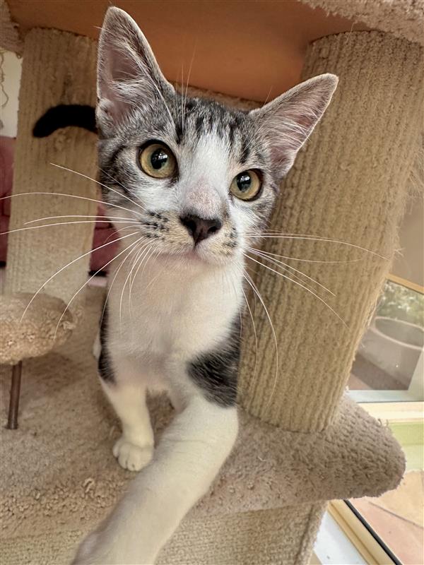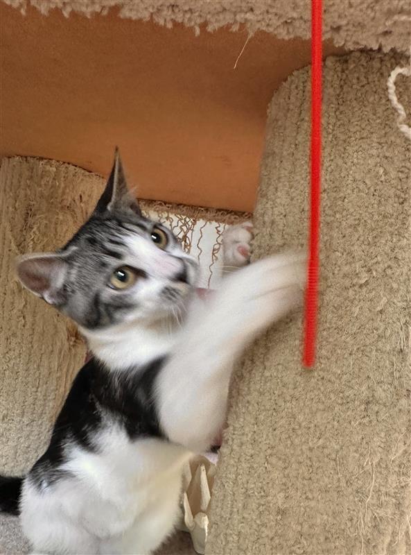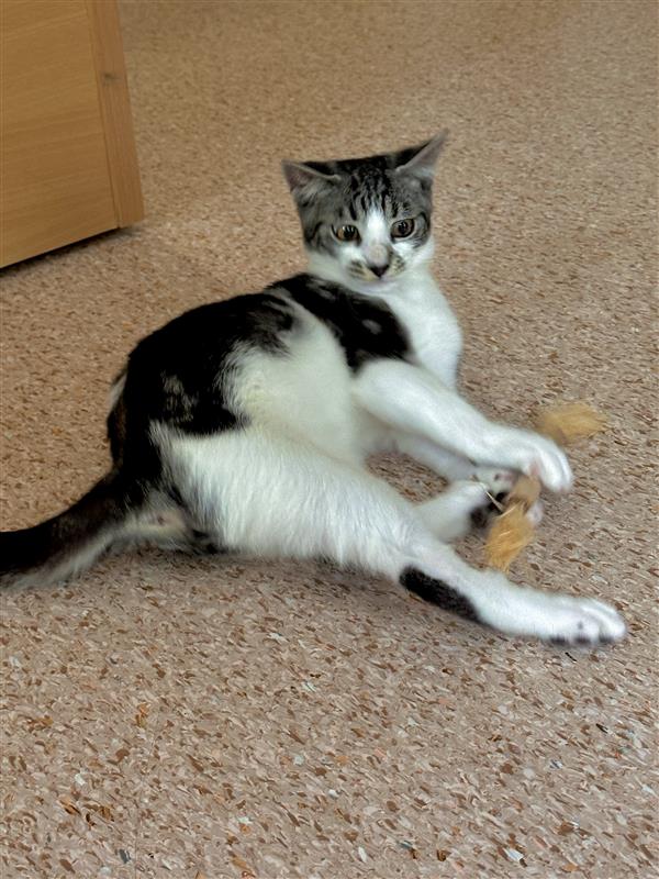 I have high energy and I’m looking for a home that can keep up with me. I love to play, zoom, chase toys, and then dive straight into cuddles before bouncing back into action again. I thrive on interaction and want to be around my people as much as possible.