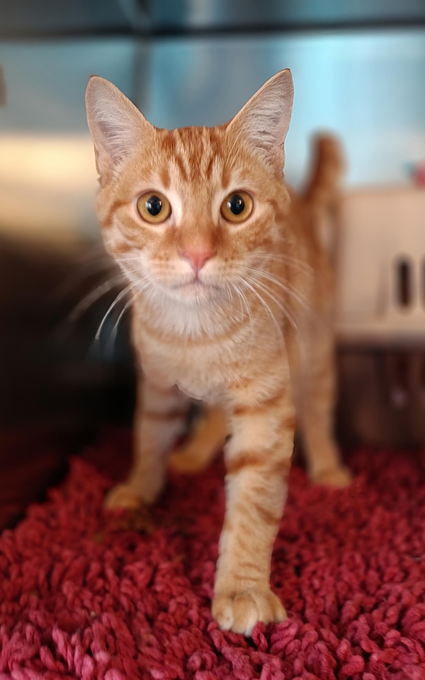 Spook is an adorable ginger male kitten with a unique half tail that adds to his charm! Once a very fearful little fellow, Spook has been on quite the journey of transformation. Initially, he would hiss and hide away from strangers, but thanks to patience and love, he has blossomed into a more confident companion. Now, Spook revels in gentle pats and affectionate snuggles, proving that with the right care, a once-timid kitten can thrive.