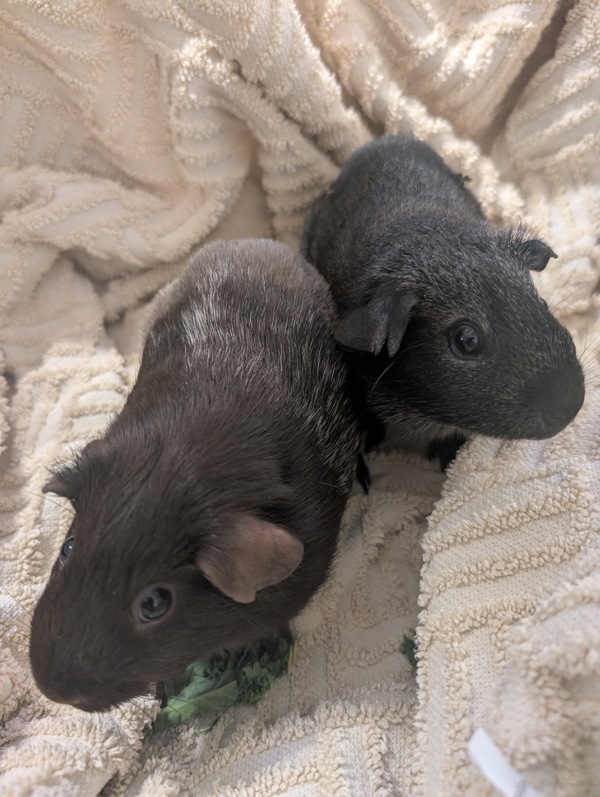 They both enjoy fresh veggies like bell pepper, cucumber, romaine, and coriander, plus a source of vitamin C since guinea pigs can't produce their own, unlimited hay and plain pellets. Cozy hideouts and gentle pats once they get to know you. Watching them chat, zoom around, and snuggle up together is guaranteed to bring a smile to your face every day.