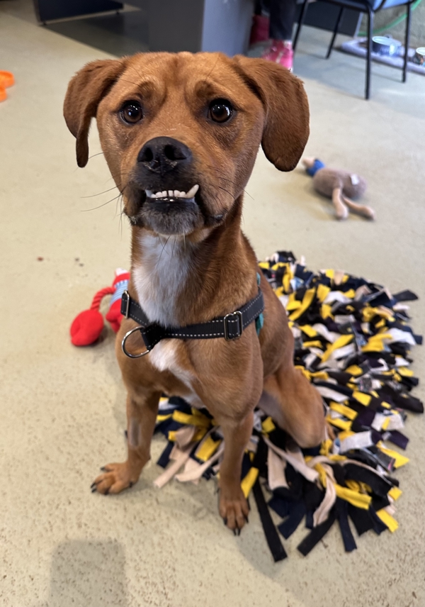Meet George! He's a charming boy with a heart as big as his puppy-dog eyes - and a remarkable underbite that makes him look like he's always halfway through a cheeky grin. This sweet guy is just beginning to discover the joys of pet life and is looking for a patient, loving home to help him build confidence and feel safe. He's a very smart boy, loves learning new tricks (and loves the treats that come with it), and has started to enjoy solo playtime with his toys. George would thrive in a calm, adult or teen household with a spacious and quiet backyard, and with people who understand that slow and steady wins his heart. He may be able to share his home with a calm, desexed doggy friend after proper introductions, pending a meet and greet. If you're ready to cheer him on as he blossoms into the goofy, loyal companion he's meant to be, George is ready to take those steps with you - one paw at a time.