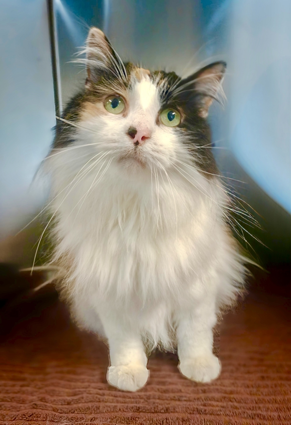 Meet Puss Puss, a stunning calico Domestic Medium Hair with a soft, sweet nature that will melt your heart. This lovely, quiet girl enjoys the peaceful life, spending much of her day snoozing in cozy spots and watching the world go by. Her gentle temperament makes her a perfect companion for someone seeking a calm and affectionate feline friend.