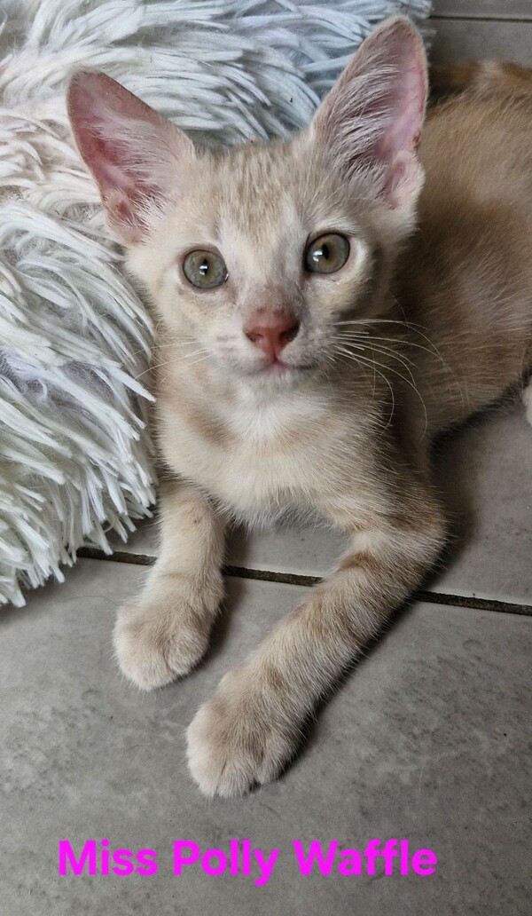 Hi there! I'm Miss Polly Waffles, a gorgeous cream-colored kitten with a personality as delightful as my name. I'm gentle, affectionate, and love nothing more than curling up in a cozy spot after a little playtime.