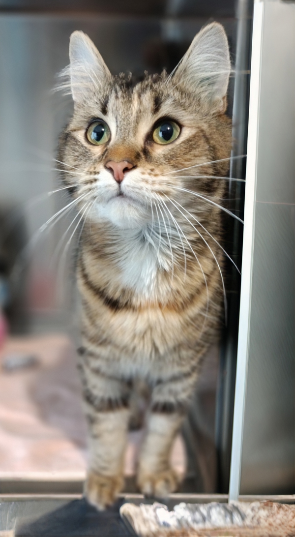 Nebula is a lovely older female kitten with a heart full of love and a personality that will brighten any room. This social little lady is always eager to greet new faces and is absolutely crazy for affection. She loves to curl up on your lap for cuddles and will purr contentedly as you shower her with attention. With her bright, sparkling eyes and gentle nature, Nebula is sure to steal your heart in an instant.