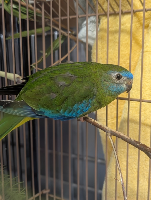 Say hello to Pippin, a beautiful female turquoise parrot with a big personality packed into a petite body. With her stunning feathers and curious nature, Pippin is ready to bring colour, chatter, and charm into your life.