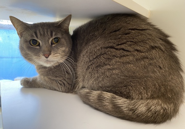 Meet Cinder! With a soft, smokey grey coat, just like the ashes she's named after... Cinder is a soft hearted girl with a gentle soul and quiet grace. Though shy by nature, she's incredibly sweet and longs for a peaceful home where she can feel safe, loved, and understood. With time, patience, and tender care, Cinder will slowly come out of her shell and reward her adopter with deep affection and quiet companionship. She's best suited to an experienced cat adopter who can read her subtle cues and let her set the pace. A calm launch room with cozy hideaways will help her feel secure, and respectful, older children will best appreciate her delicate nature. Cinder would thrive in a tranquil home with minimal foot traffic and may even enjoy the company of another gentle feline friend, given slow and thoughtful introductions. If you're ready to offer Cinder the serenity she deserves, she promises to fill your life with soft purrs and heartfelt love.