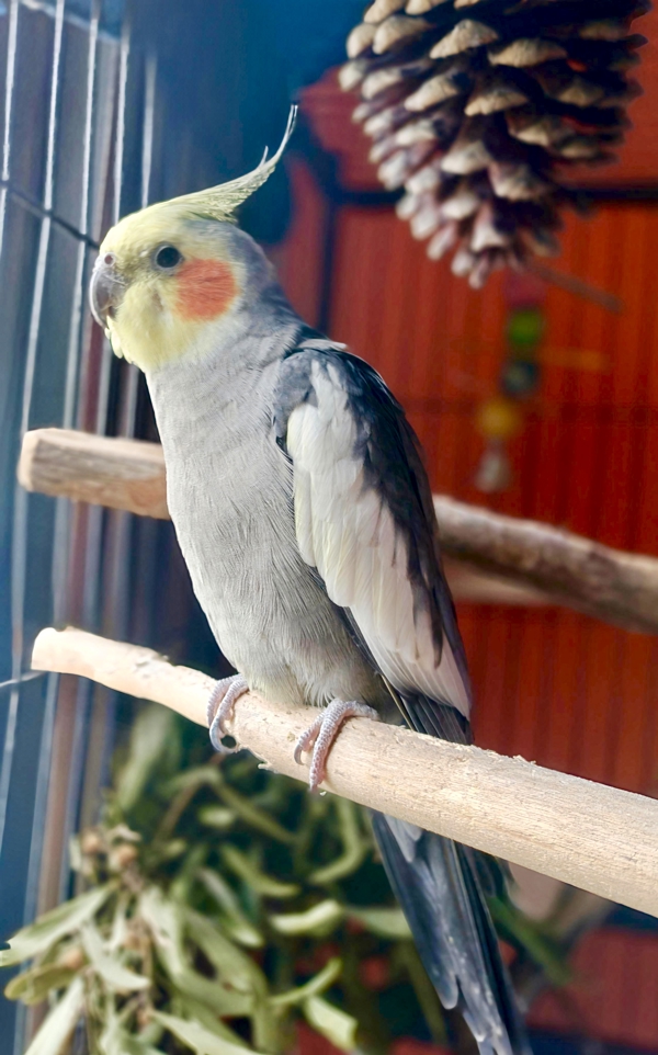 Pugsley is a bright, happy male Cockatiel who thrives on human interaction. He loves being with people, enjoys chatting, and will happily bond with his favorite humans. He's a playful, affectionate bird who may nibble when excited-gentle handling and steady routines help him stay sweet. He whistles very unique tunes most of the day, turning everyday moments into a little concert.