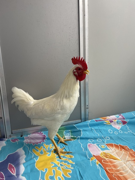 While Rufus can be a little unsure about close handling at first, he's learning that kind hands bring good things-like treats, gentle words, and the occasional scratch behind the comb. With a bit of patience and a calm environment, Rufus blossoms into a curious and charming companion who enjoys watching the world go by and chatting softly with his flock.