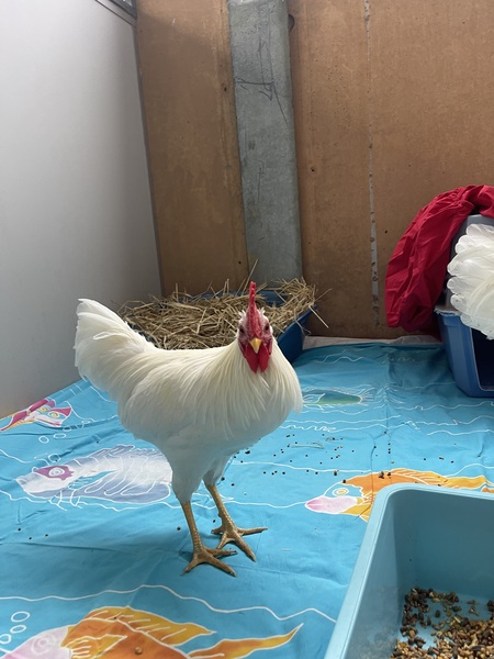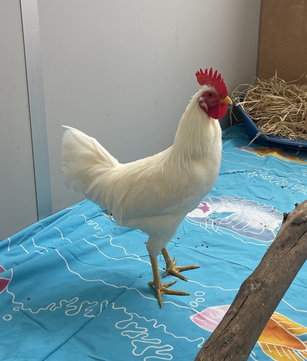 Rufus is a stunning Polish Bantam white rooster with a crown of soft, feathery plumage and a proud, elegant stance. Beneath his striking appearance lies a gentle heart that's just looking for a safe place to call home.
