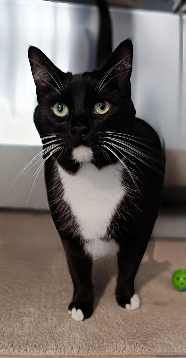 Bentley is a black and white tuxedo male, around 4 years old, with a sensitive, quiet soul who loves quiet moments with his people and adores a cuddle. He can be shy at first, so he does best in a calm, patient home. He's been bullied by other cats, so he's happiest as the only cat in the household.