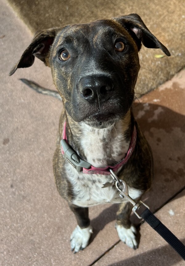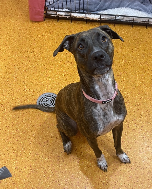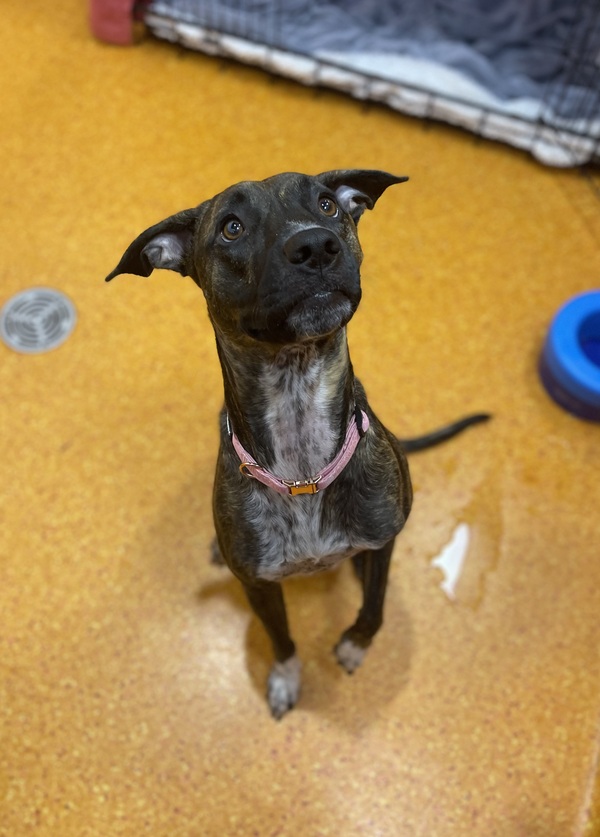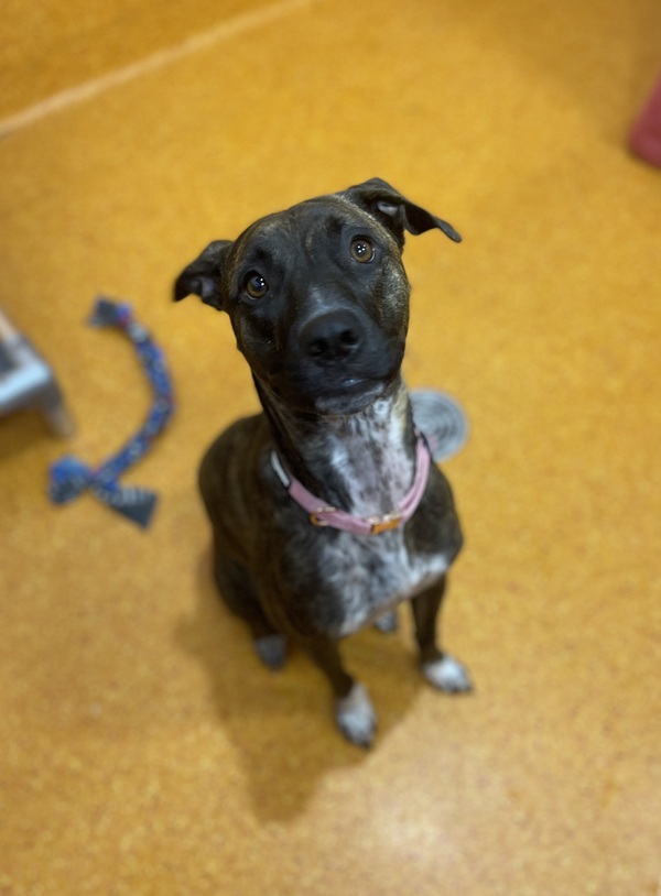Winnie is a shy and sensitive young lady with a gentle heart and a playful spirit. She thrives with calm introductions and would do best in a peaceful home with structure and routine to help her feel safe and settled. Once her confidence grows, her cheeky side shines through-she loves squeaky toys, tug games, and dunking her whole face into her water bowl - making a clam shell or kiddie pool a perfect addition to her playtime.