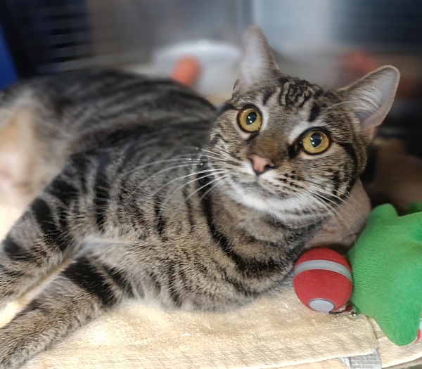 Boo is a one-year-old female tabby with a keen, alert personality. She's playful and inquisitive-always eager to explore her surroundings and meet new people. Boo has lived with other cats and is tidy in her habits, keeping her space neat and clean.