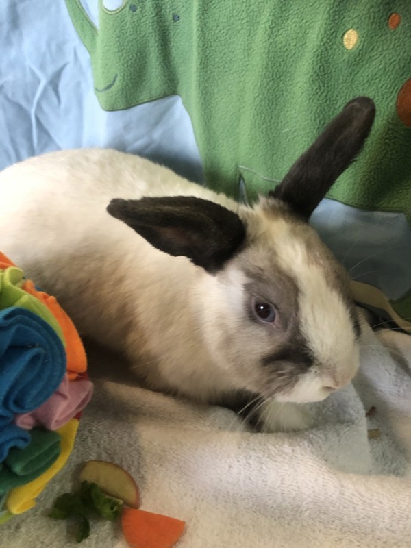 I am young man who is still learning about the world and as a result I might get into some mischief. I'd love lots of enrichment activities to keep me entertained and out of trouble! I love nibbling on hay filled puzzles, hopping through tunnels, and playing with chew toys or cardboard castles. A little variety will keep me feeling engaged and delighted! I love to show off that I am having a great time with lots of bunny binkies!