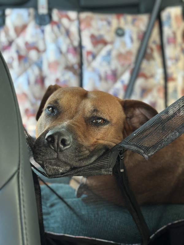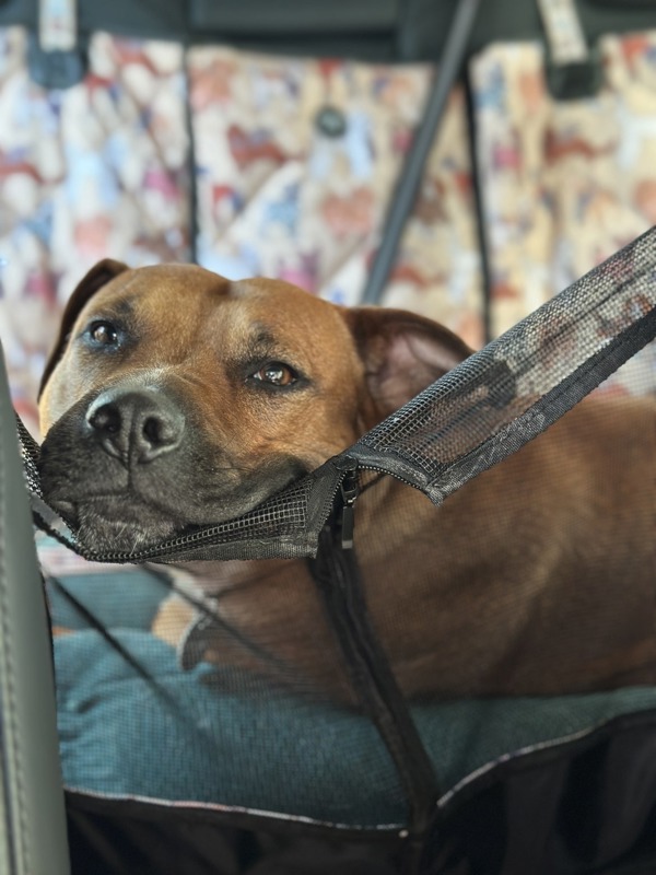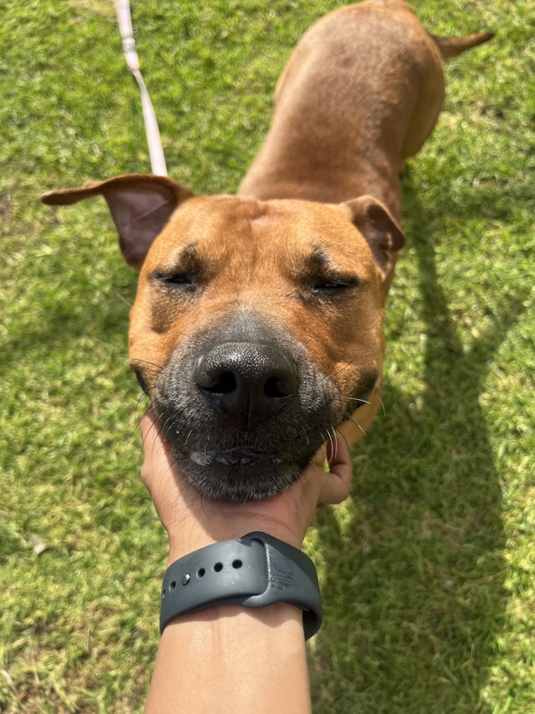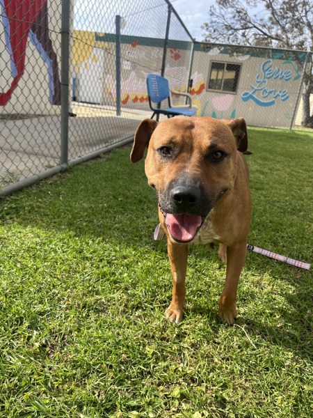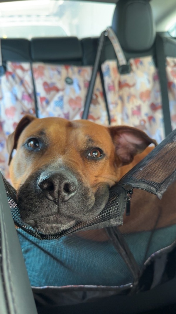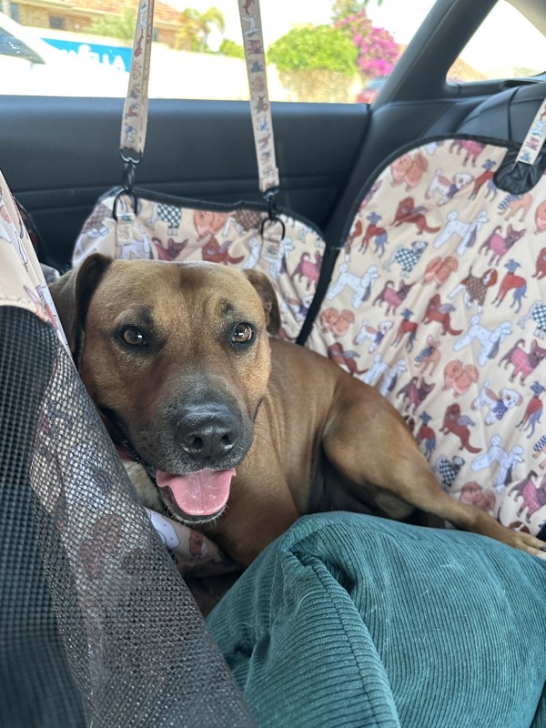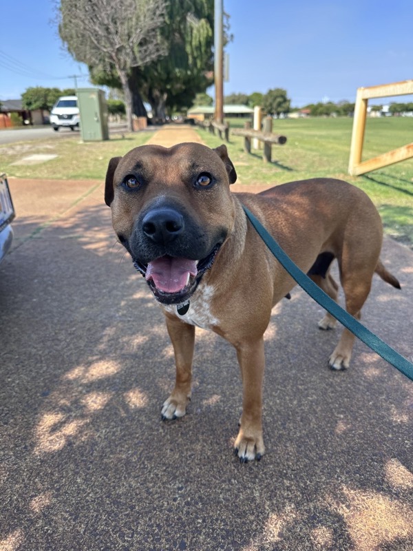Hi there, I'm Birdo! I'm a 5-year-old Staffy mix with a gentle heart and the sweetest smile you'll ever see. I might look a little shy at first, but once I get to know you, I'm all cuddles, tail wags, and happy sighs. I've had a bit of a quiet start in life, so I'm looking for a calm, patient home where I can feel safe and loved as I come out of my shell.
