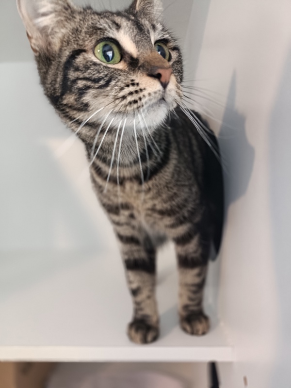 Meet Panda-a female tabby with a silky shorthair coat and a heart full of spunk. She's an outgoing, active girl who loves to explore, play, and chat-yes, she's quite vocal and enjoys a good meow to grab your attention. Panda is food-motivated in the best way, always excited for a tasty treat or a shared meal, and she keeps life lively wherever she goes.Having raised a lovely litter of four healthy kittens, Panda is ready to settle into a new home where she can be the center of attention again. She's affectionate, social, and thrives in an active environment with daily playtime and enrichment. If you're seeking a spirited companion who will keep you on your toes and fill your days with energy and joy, Panda is eager to meet you