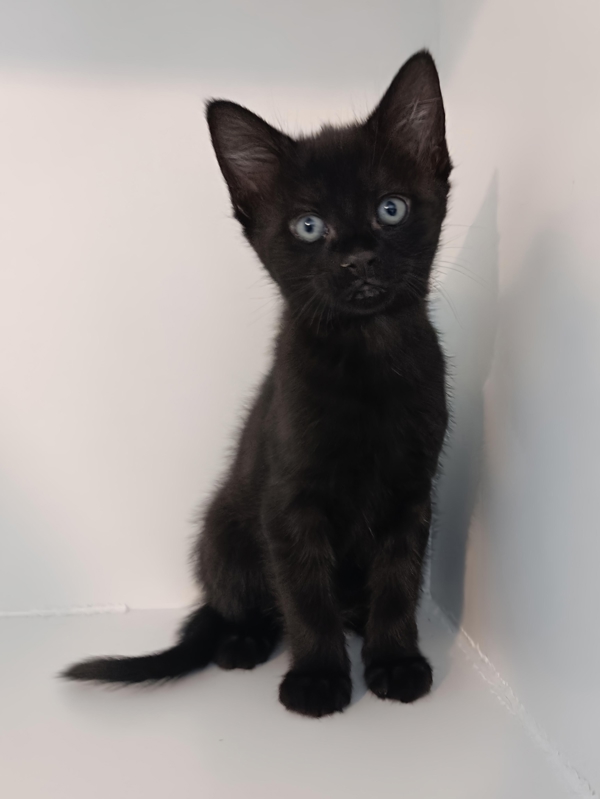 Meet Monkey, a happy black male kitten with a glossy coat and a big personality. He's playful and inquisitive, always on the hunt for a new toy or a hidden corner to explore. From zoomies across the floor to careful investigations of every texture, he approaches life with sunny energy and a big appetite for fun. After a lively play session, he'll happily melt into a content, purring cuddle.