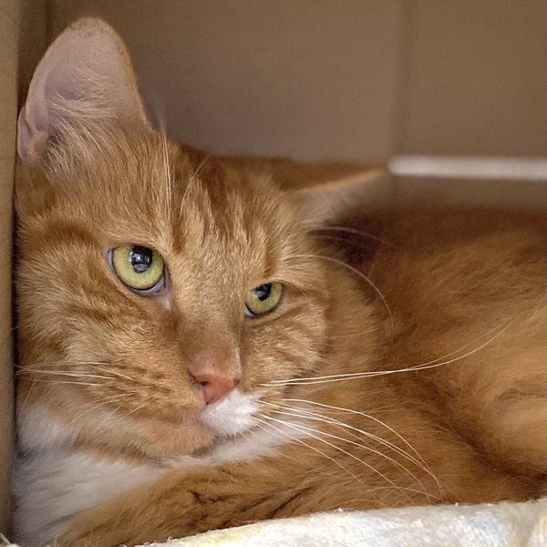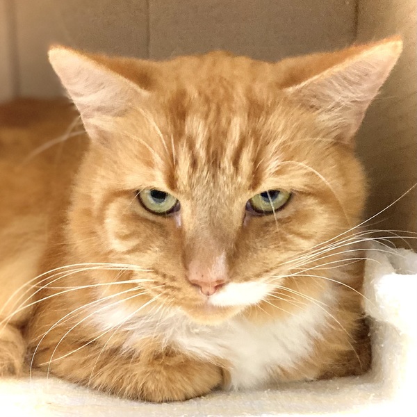 A quiet, mature home without other pets would suit him best. Sudden noises tend to frighten him and other cats and dogs may make him a little fearful and he'll want to retreat. Due to his quiet nature, Nugget would benefit from a "launch room" in his new home.