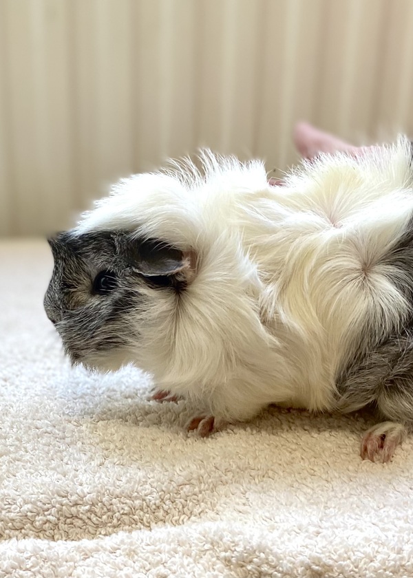 Meet Renult, a male Abyssinian Guinea Pig with a grey and white coat.