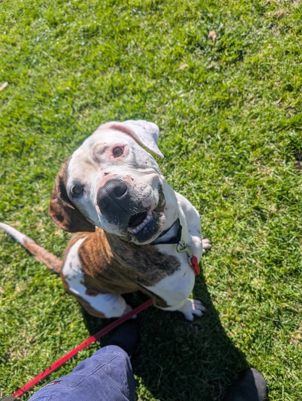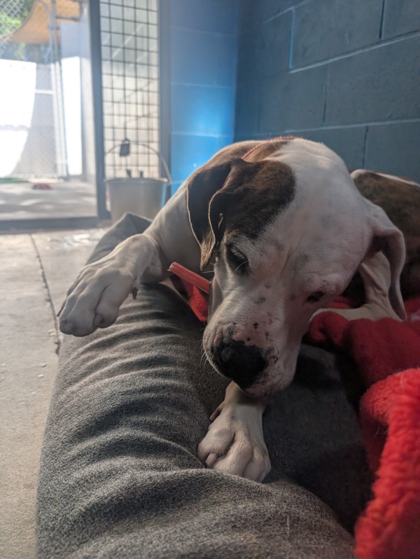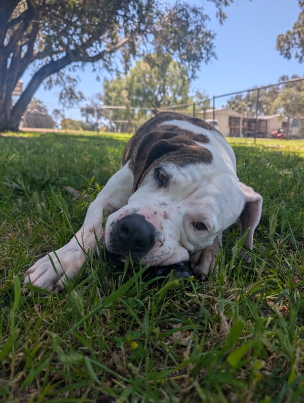 Hi, I'm Kyla, a bright, cheerful 5-year-old American Bulldog with the perfect mix of easy-going charm and lively, happy energy. I love my comforts - soft beds, gentle fuss, and a good snooze and lots of yummy treats along the way - but don't let that fool you, I still enjoy my playful moments and a good burst of excitement when something fun is happening.