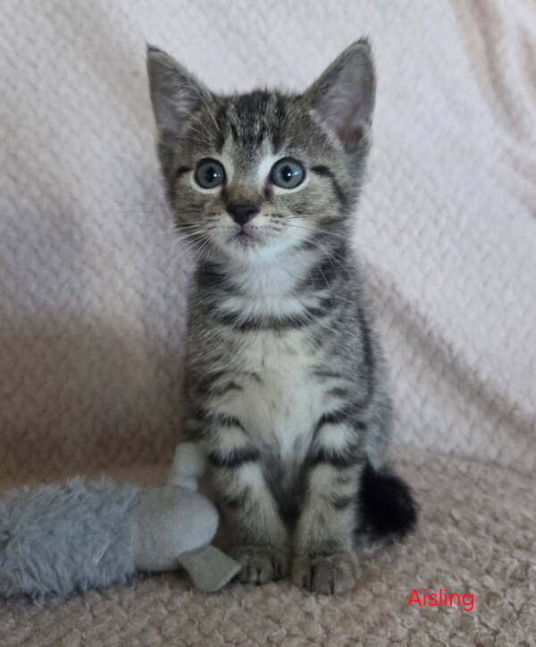 Hi! My name is Aisling (pronounced ASH‑ling), and I'm the little grey‑and‑white sister of this playful bunch. I'm curious, confident, and full of charm - the perfect mix of sweet and spirited.