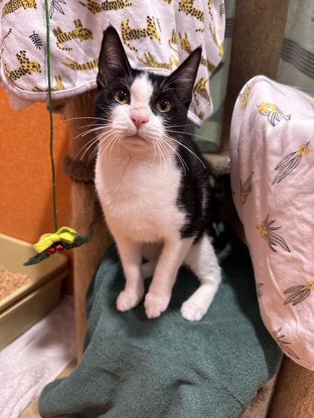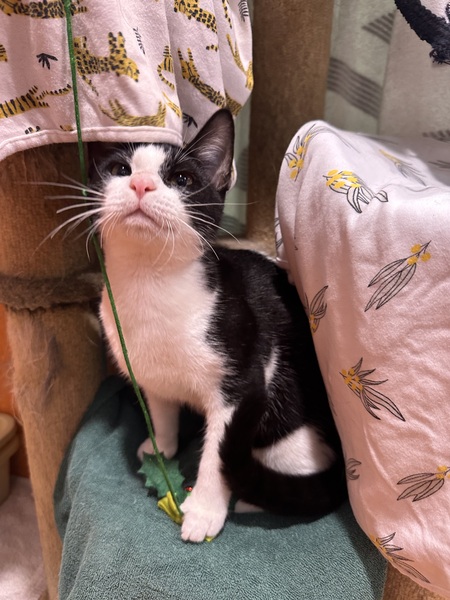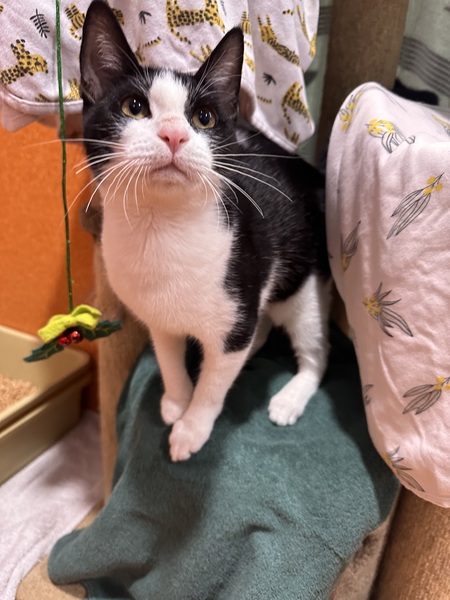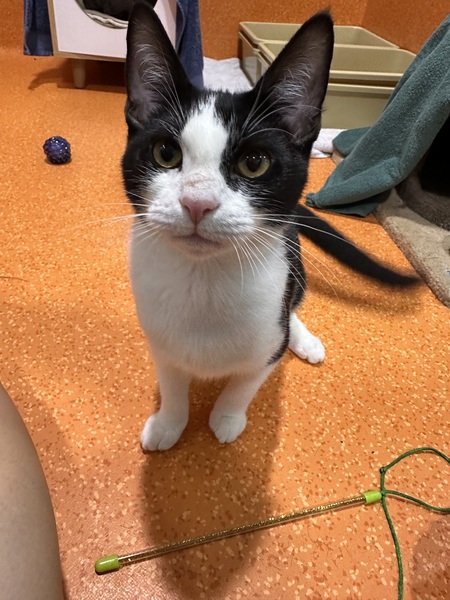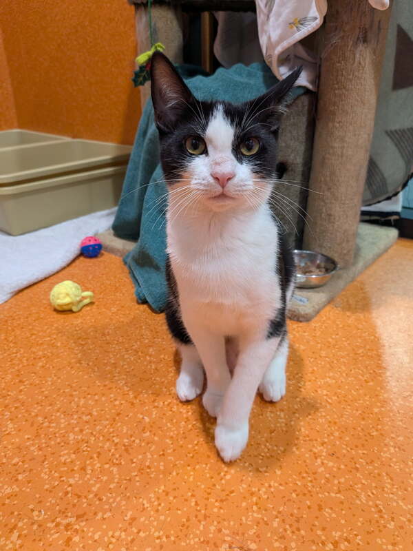 Providing plenty of safe spaces-scratch posts, cat trees, hides like cardboard boxes or igloos, and access to high shelves and dressers-will help Penguin feel secure. She enjoys gentle affection, especially chin and cheek rubs, and will sometimes roll onto your hand purring and kneading with her paws.
