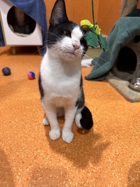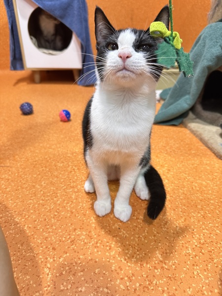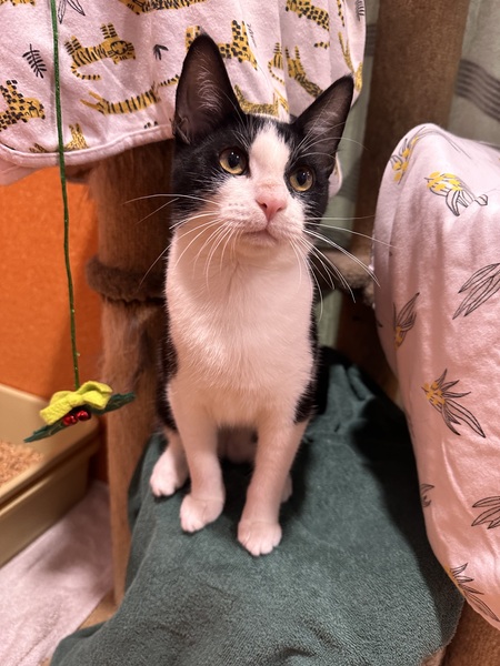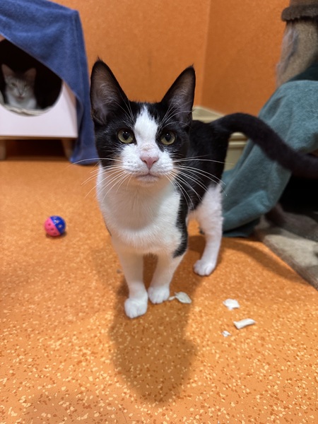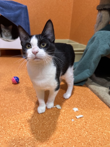 Penguin would do best with a patient, understanding adopter who can read her body language and give her time to warm up. Older children or teens are ideal. She is social and may enjoy the company of a calm cat companion, particularly since she came in with littermates. Penguin startles easily with loud noises, so a quiet home will help her thrive.