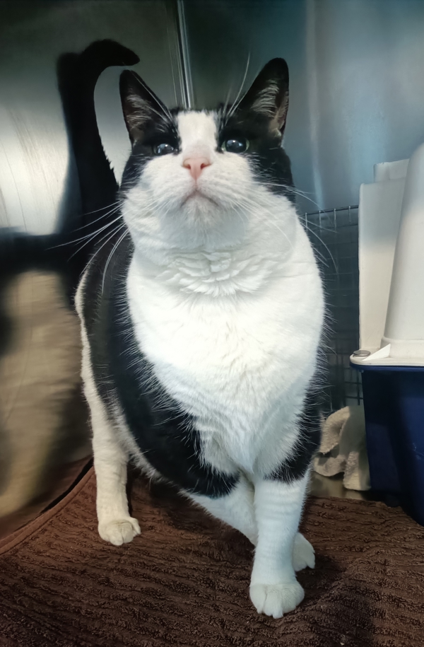 Pingu is a charming black and white tuxedo girl with a welcoming personality and a face that's impossible to resist. A bit of a chubby lass, she wears her extra fluff proudly and uses it to maximum cuddle effect. Pingu absolutely loves people and is always happy to greet visitors, making her a wonderful companion for a home that enjoys an affectionate, social cat.
