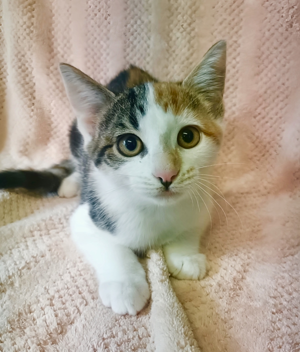 Mango is a beautiful calico kitten with stunning, unique markings that make her impossible to forget. This pretty girl has a very outgoing personality and is always ready for fun-whether it's chasing toys, exploring her surroundings, or making new friends. Full of energy and confidence, Mango brings a spark of happiness wherever she goes.