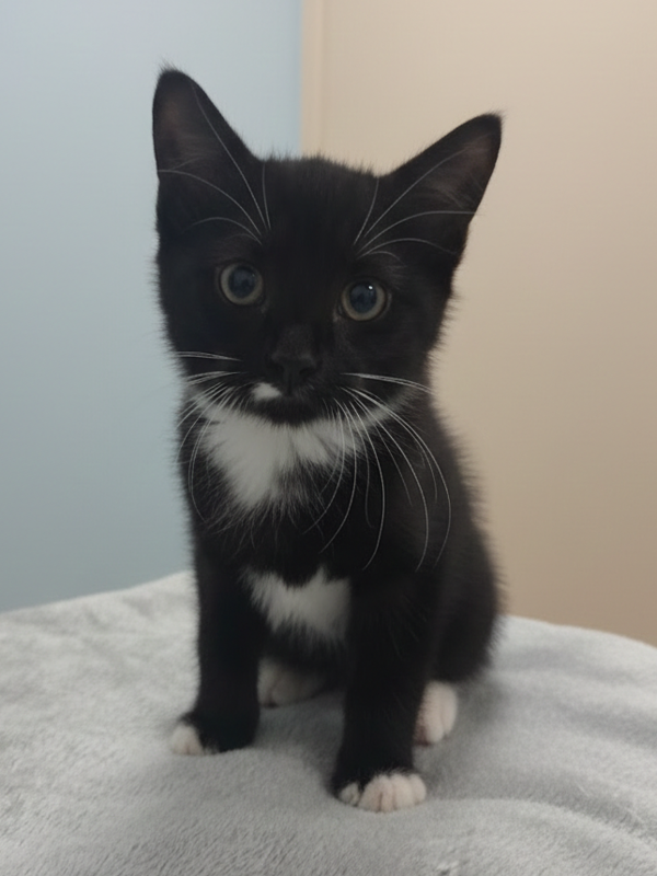Say hello to Odysseus, a charming black and white kitten with a striking white beauty spot on his face! This little explorer may prefer the quiet comforts of home, but once he gets to know you, he'll quickly show you just how affectionate and loving he can be.