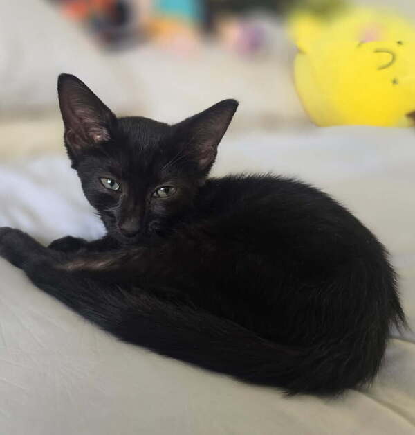 a tiny black kitten with a brave heart and a whole lot of love to give. I may be small, but I'm tougher than I look, and I've come such a long way to be ready for my forever home. Despite everything, I've grown into the most affectionate little girl - I adore being close to my humans and prefer to spend my day following you around, curling up near you, or nudging you gently for more pats.