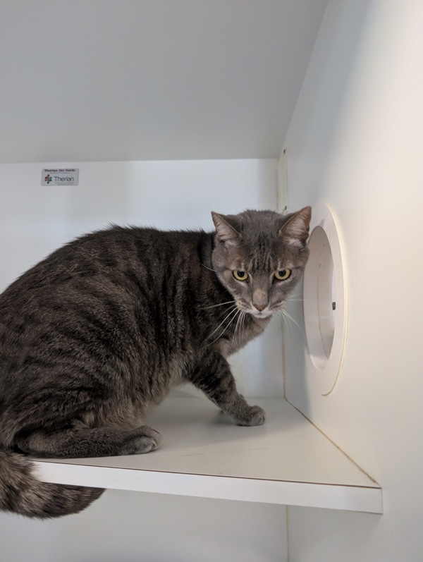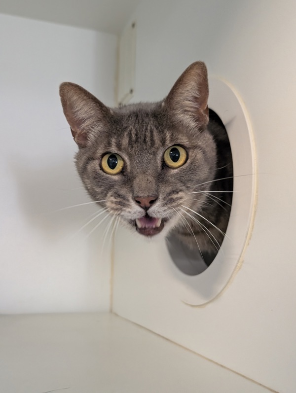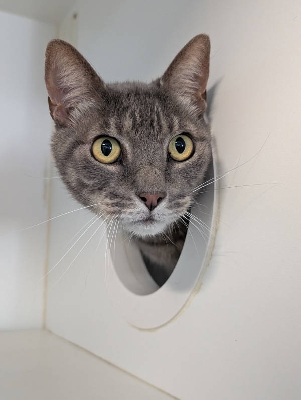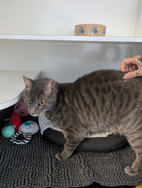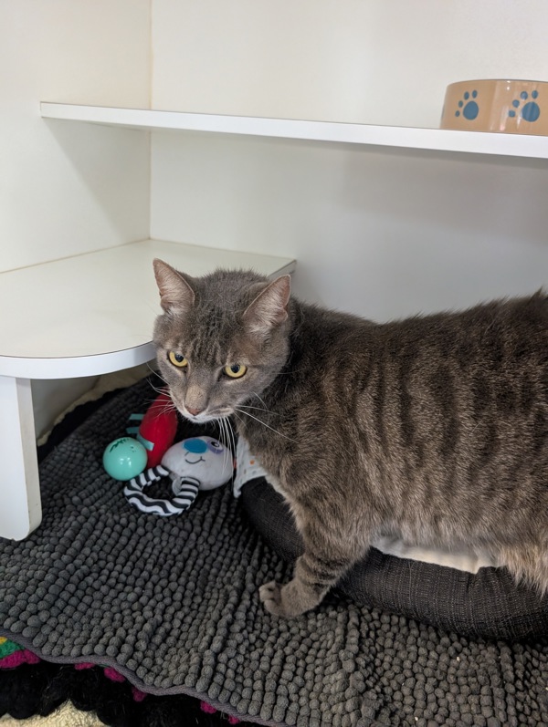 I'm a 4-year-old tabby boy with very handsome stripes (I've been told) and a tiny little meow that I use when I'm feeling brave. I'm a bit chatty, but also very shy at first. I like to hide in cozy spots where I can watch the world quietly and decide if it's safe yet.