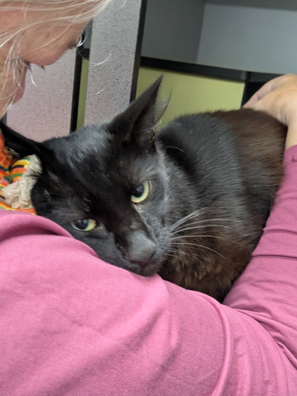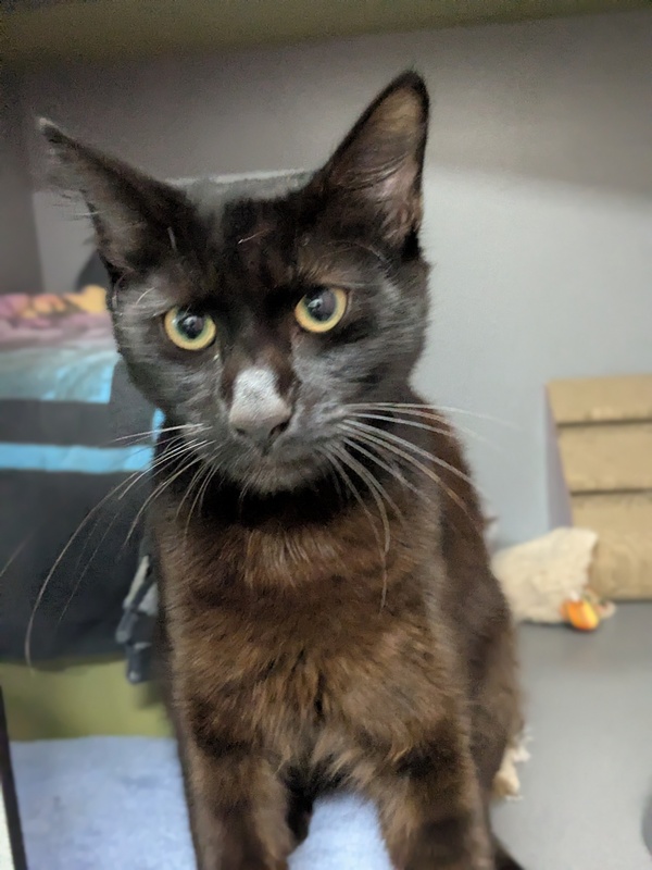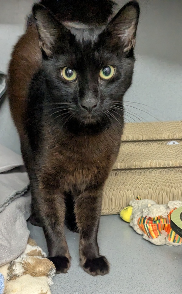 Hey there, it's Daffy here, an 18 month old black male kitty looking for a new home to share my love. Now you're probably thinking that with a name like Daffy I must have some duck-like qualities but there's nothing quacky about me and I tend to pad rather than waddle my way around. Anyhow, I digress...... I'm a delightful cat (no bias here) and I'm sure we'll make great friends once we meet. You'll certainly have a catpanion that loves to lounge, to dine, to sleep, to sidle up beside you to let you know I love you (or I need some attention or food), and to chase imaginary butterflies or play with ribbons and other toys, oh, and a good scratching post would be an absolute dream.