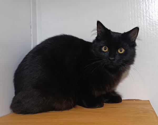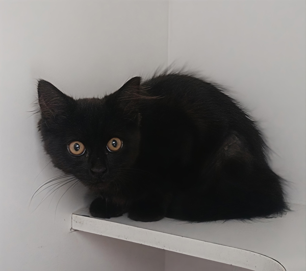 Connie is a beautiful female black kitten with a sleek short-to-medium length coat and the softest, most thoughtful little expression. She's a little on the shy side at first, preferring to take her time to observe the world around her. More introverted than her outgoing siblings, Connie has a gentle, sensitive nature that makes her incredibly special.