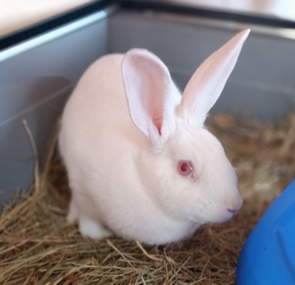 Cinnamon Roll is a stunning albino lady with the softest snowy-white fur and the prettiest pink eyes you've ever seen. This desexed, vaccinated, and microchipped girl knows exactly who she is - a confident, sassy queen with a little attitude to match her beauty! She adores her daily greens and enjoys good-quality rabbit food, and she'll happily show you her excitement at mealtime. Because of her delicate albino coloring, Cinnamon Roll will need proper sun protection and an indoor-focused lifestyle to keep her safe and comfortable.