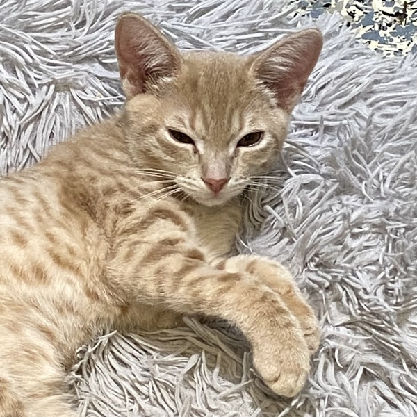 When it comes to meeting people, our little girl, Virginia, has a sweet 'wallflower' personality where she likes to check things out before she becomes involved. She loves you, however, to spend time with her - talking softly to her and giving her gentle pats. Once she has become comfortable with you, she will respond with lots of purrs and cuddles. When it comes to playing with her four siblings, she can hold her own with the boys. Virginia has a very striking cream-ginger tabby coat and beautiful soft eyes. We recommend the following care:-