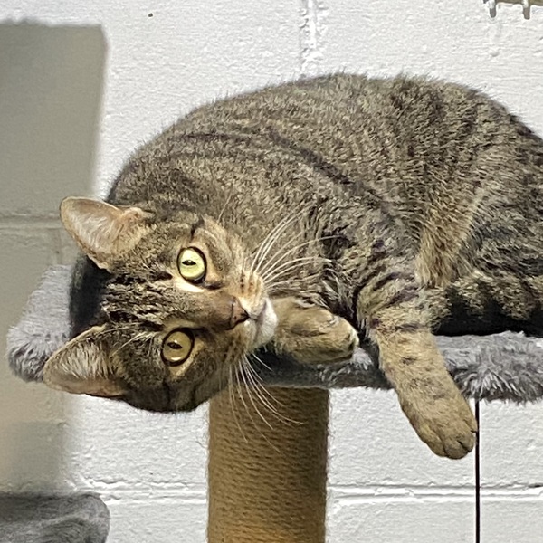 Clover will make a wonderful companion for a gentle, mature cat lover. She has a stunning dark-brown spotted coat, with a cute white patch on her chest. Her big, yellow-coloured eyes will pluck at your heart strings.