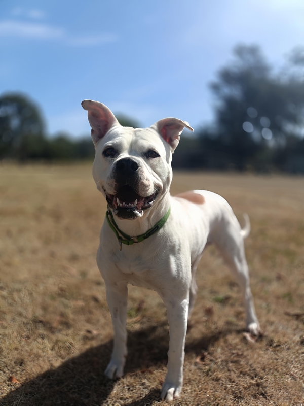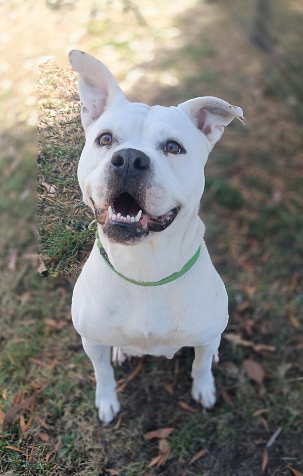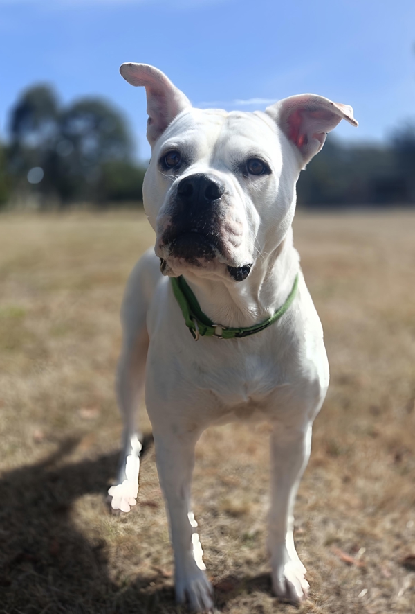 Angel is a beautiful female American Bulldog with a gentle heart and a deep love for people. After a rough start in life, she has come a long way and is now enjoying the comfort and care she deserves. Angel walks like an absolute dream on the lead and has a lovely calm nature that makes spending time with her a real pleasure. She is very food motivated and absolutely adores her tasty treats-which may explain how she's become a little on the chunky side lately!