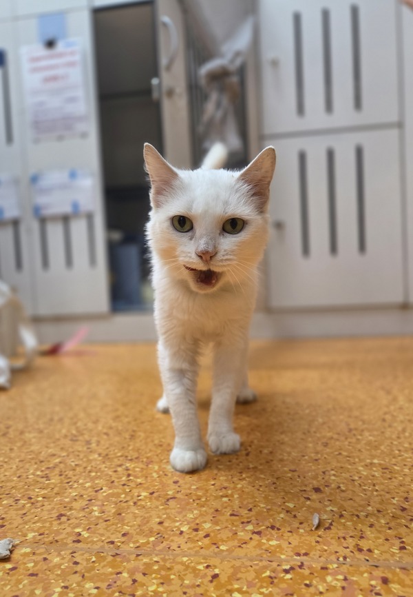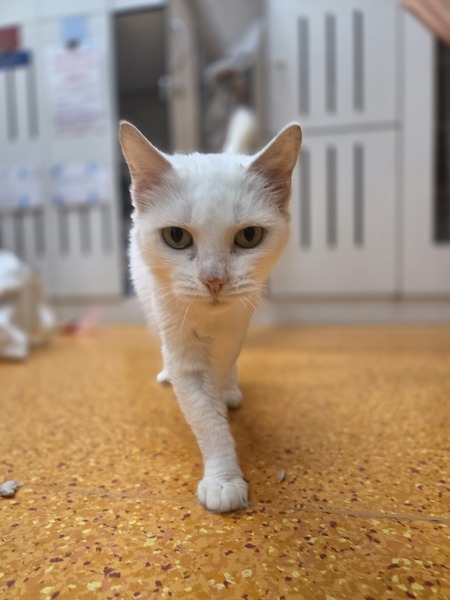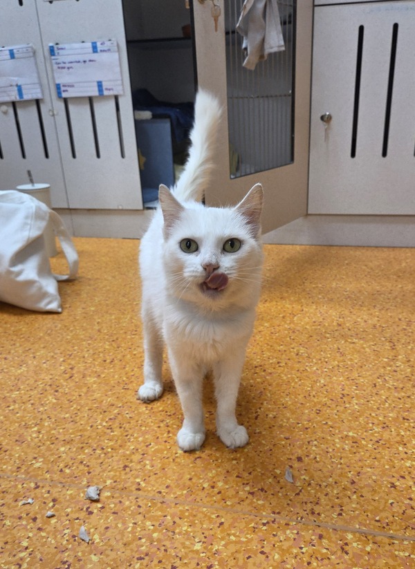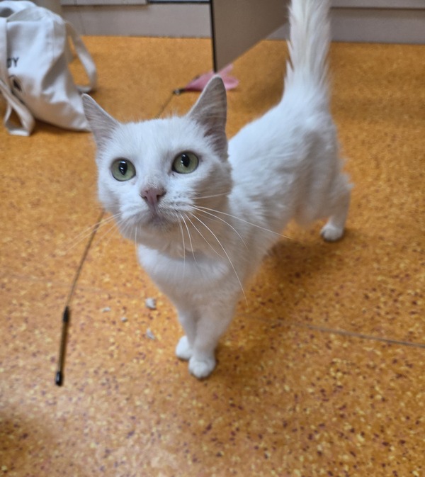 Snow is a truly standout girl with a beautiful white coat that melts hearts at first sight. Her striking appearance is matched by a gentle and affectionate nature, making her hard to resist. She would thrive in a calm, loving home where she can feel safe and cherished, enjoying gentle pats and quiet companionship.