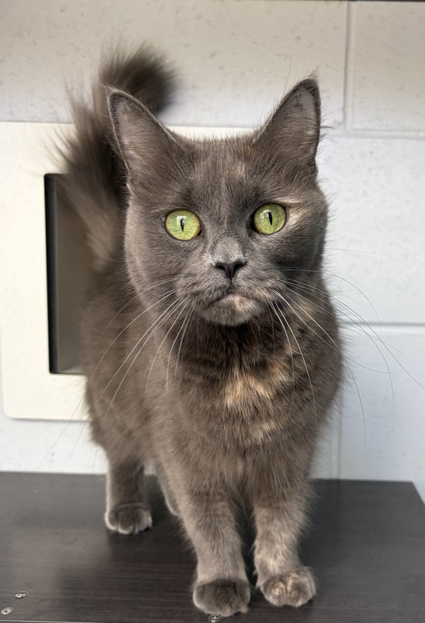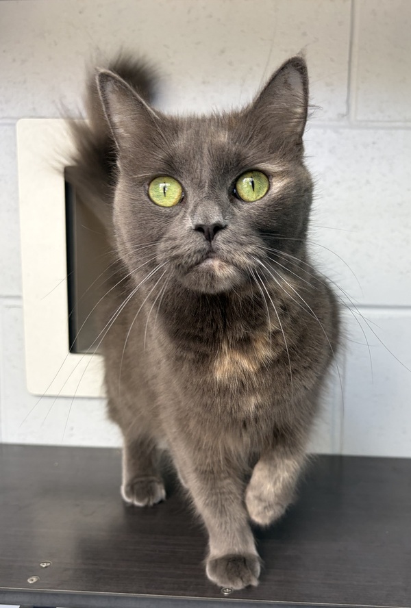 Meet Agnes, a strikingly beautiful girl with piercing green eyes and an unforgettable presence. Agnes is a quirky cat with a big personality, loving attention while still enjoying her independent moments. She greets you with a soft, chirpy meow, happily announcing her arrival or welcoming you home. Confident and charming, Agnes carries herself like royalty and expects her home to match. She will thrive with someone who appreciates affection balanced with respect for her space. Agnes is sure to become a loving companion and the elegant queen of her forever palace. She is ready for adoption now and waiting patiently.