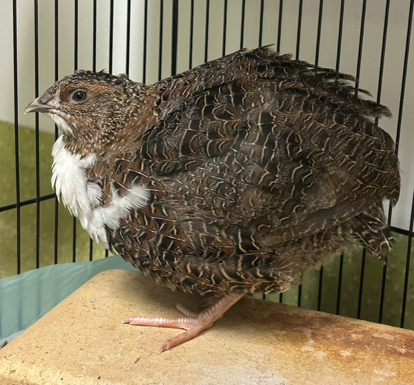 Queen is a female King Quail with a gentle, quiet temperament. She is a ground-dwelling bird who requires secure, fully enclosed housing with soft bedding and protection from weather and predators. A sheltered indoor enclosure or protected aviary is recommended.Queen needs a balanced diet consisting of quality quail or finch seed mix, game bird or quail crumble, fresh leafy greens in moderation, and constant access to clean water, grit, and calcium.She can live with another calm female or a gentle male and is best suited to a quiet home. King quail are not hands-on birds and should not be handled frequently. Queen is not suitable for households with young children.Her ideal home will have appropriate housing already set up and a caregiver who understands or is willing to learn the specific needs of small quail.Adoption price - $10