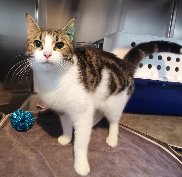 Misha is a beautiful young tabby and white girl with a personality as bright as her markings. Outgoing, social, and full of curiosity, she's the kind of cat who will happily greet you at the door and make herself right at home in your heart. She has a sweet little white tip on her tail that perfectly matches her charming, playful nature.After recently raising a litter of kittens, Misha is ready for a home where she can finally be the one getting all the attention. She absolutely loves her food and will never say no to a tasty treat, but what she really craves is affection and companionship. Happy, loving, and full of life, Misha is ready to bring warmth and joy to her forever family.