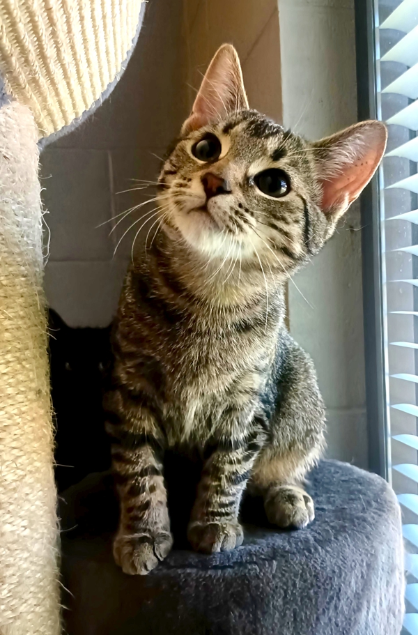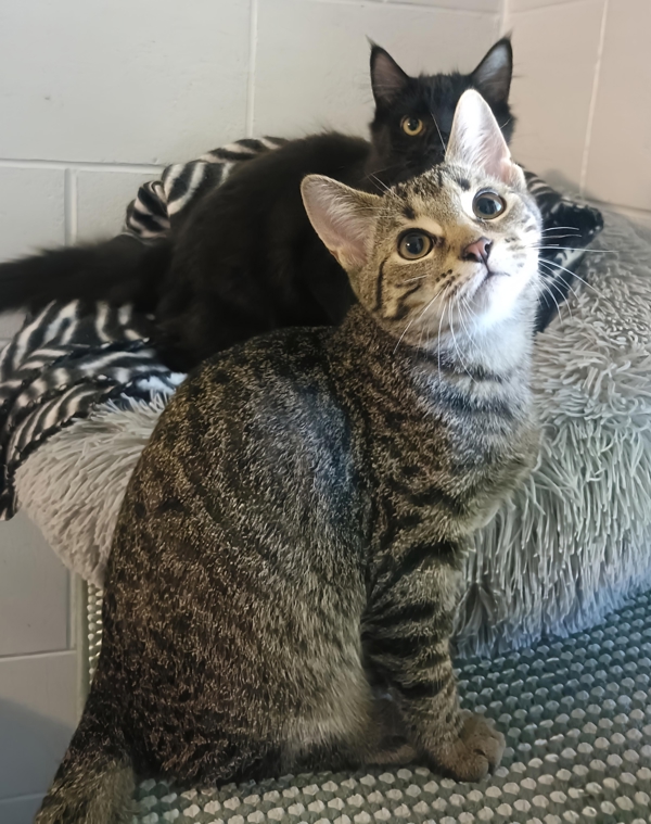 Smooch is a charming little tabby boy with a big personality and an even bigger appetite for fun (and food!). Outgoing and full of energy, he's always ready to chase a toy, wrestle with a sibling, or explore anything new in his path. He's got a cheeky, mischievous streak that keeps things entertaining, but it's all wrapped up in a sweet, affectionate nature that makes him impossible not to love.