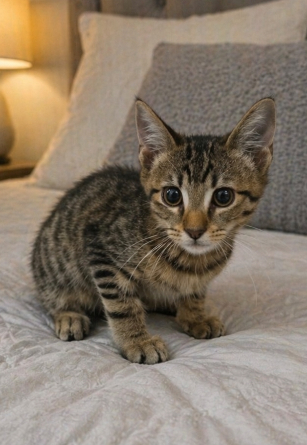 He's equal parts playful mischief and cuddle champion, always ready to explore by day and snuggle by night. With his striped coat and bright, watchful eyes, Zeus isn't just a kitten-he's a legend in the making.
