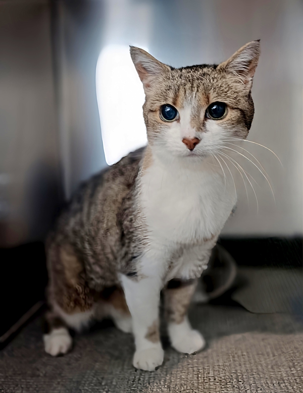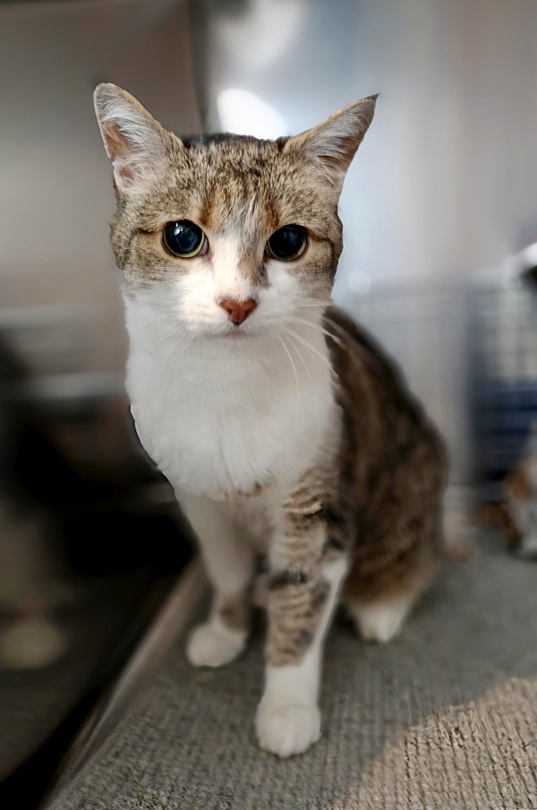 Kaila is a short-haired tabby and white cat, an almost 12-year-old lady with special needs. She is nearly completely blind, though she may still catch the occasional shadow. Kaila copes beautifully with her vision impairment and relies on her other senses to navigate. She's a lovely girl who loves her meals, and she has a charming heart-shaped mark on her nose that visitors adore.