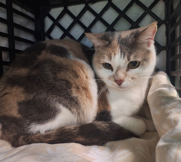 Her ideal home will be filled with cozy hideouts like cardboard boxes and cat igloos, along with scratch posts and cat trees that offer safe spots both high and low. She enjoys having access to shelves and dressers where she can perch and observe her world from a comfortable distance. Nutmeg will do best with an adopter who understands that she may take a little while to settle in and show her true personality. She's not one to rush into affection, especially around her head, so practicing touch consent is important.
