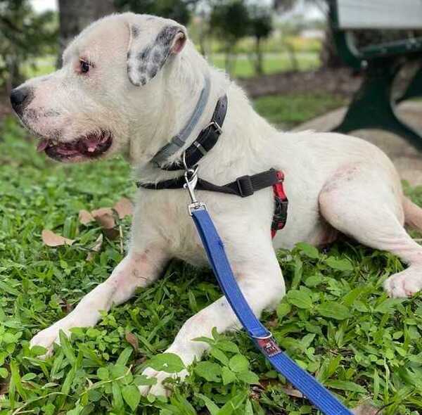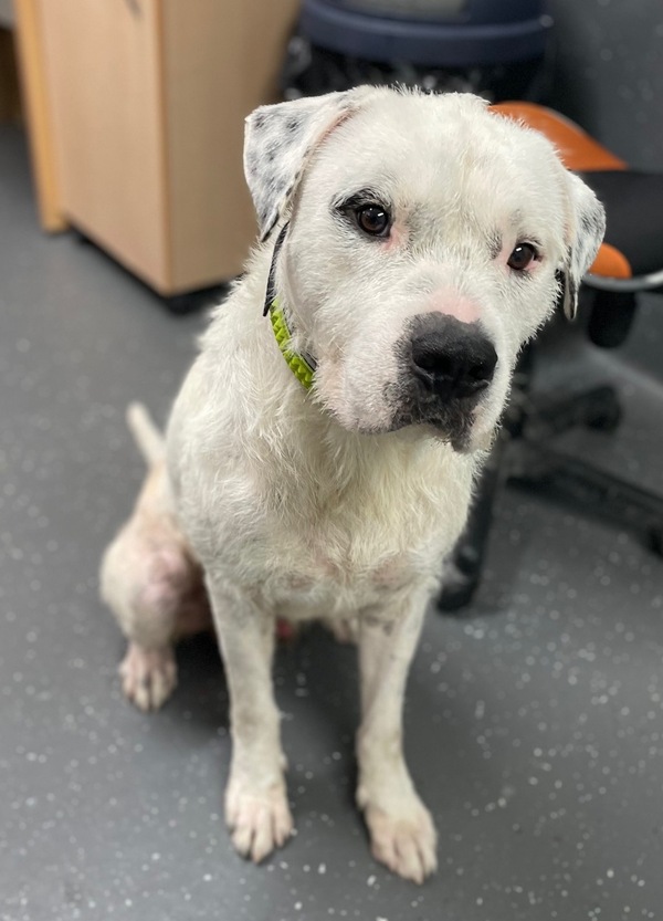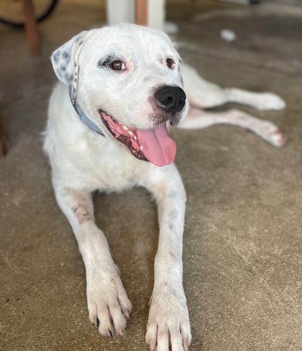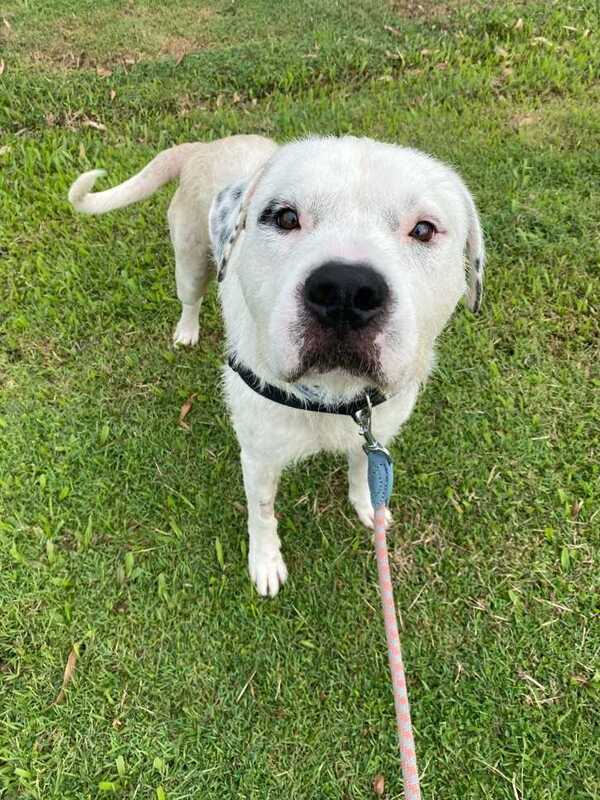 I am a big gentle giant I love spending my days lounging around and leaning against you for cuddles. I'm known for my sweet and friendly nature, always ready to greet everyone with a big smile. I adore being around people, whether we're playing in the yard or just relaxing together. I am looking for a family to understand my needs as I can be sensitive to sun as I am quite fair skinned so somewhere shady for me, so I don't get burnt. I can be stubborn at times and lay down if it's something I don't want to do but if you have a high value treat, I will be at your mercy. I was brought in with another dog so if you have another dog I would like to meet them. I have been in shelter before and is now ready for my new lease on life. If you're looking for a loyal companion to share your life with, I'm your guy. Adopting me means endless love and friendship. Let's start our adventure together!