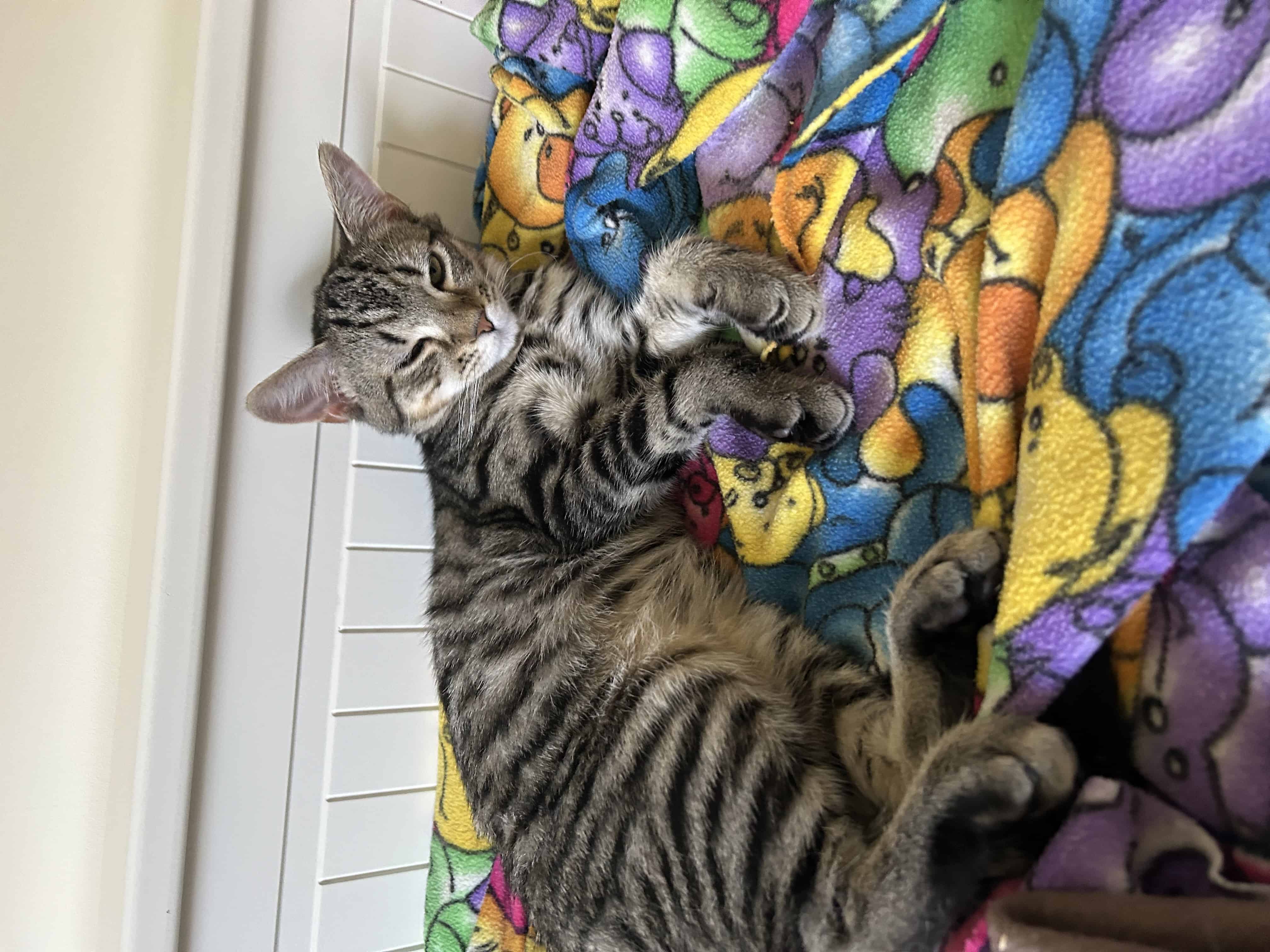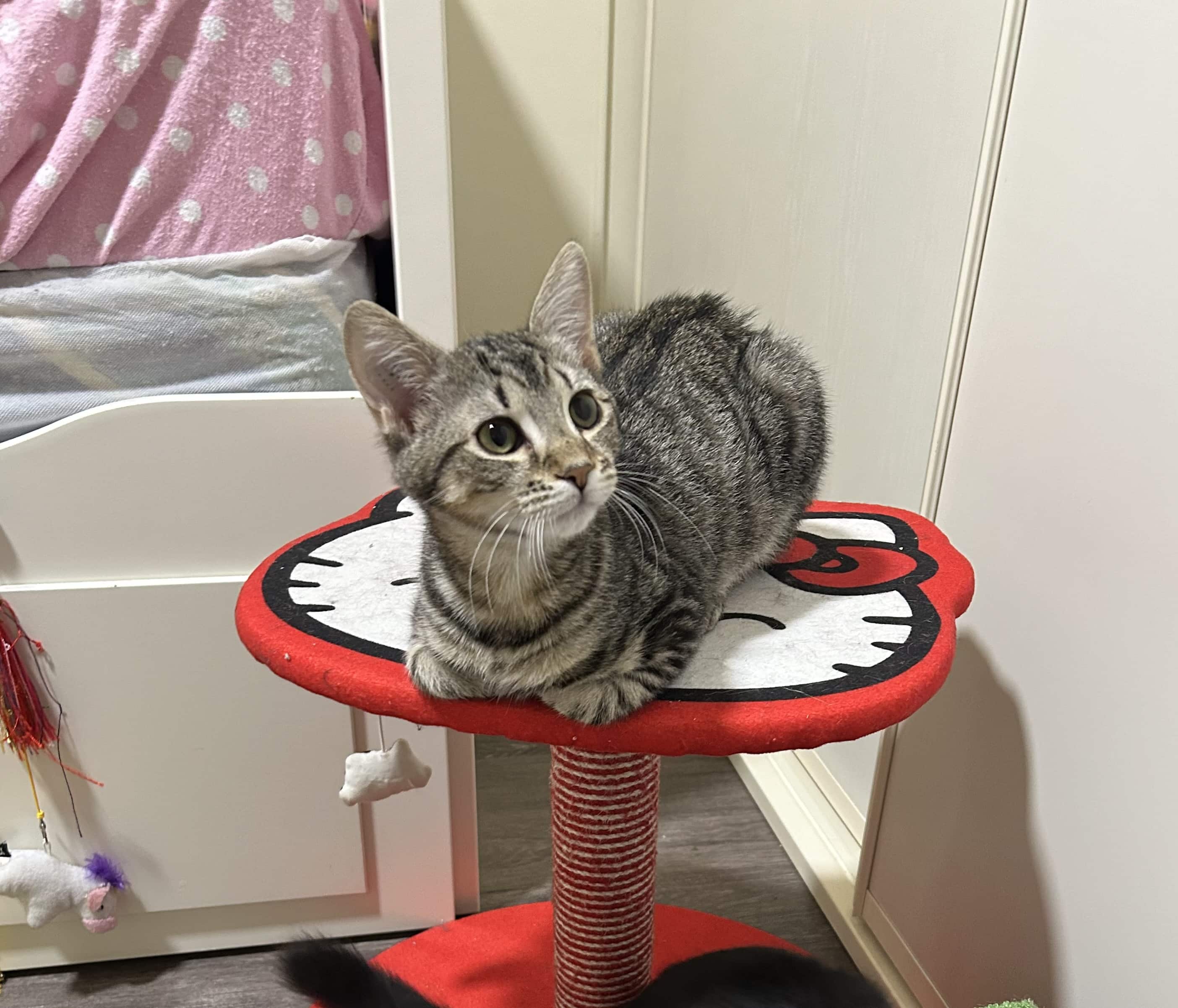 I love playing with all sorts of toys such as my wand toys, balls, and whatever else I can find such as ice cubes in my water or the sweeper when my human is sweeping. I really enjoy when my human friends play with me! I can be pretty nervous when I meet new people but once I warm up and trust you I like having pats. I’m not a huge fan of being pat on my chin but I do enjoy being pat of the back of my head all the way to my tail. I also love snuggling and playing with my best friend Batman who I am bonded to and we will be have to be adopted together. I love to look out the window especially when it’s open and admiring the outside world. I also love watching what my human friends are up to and when I hear them coming I will meow for their attention as I love spending time together.