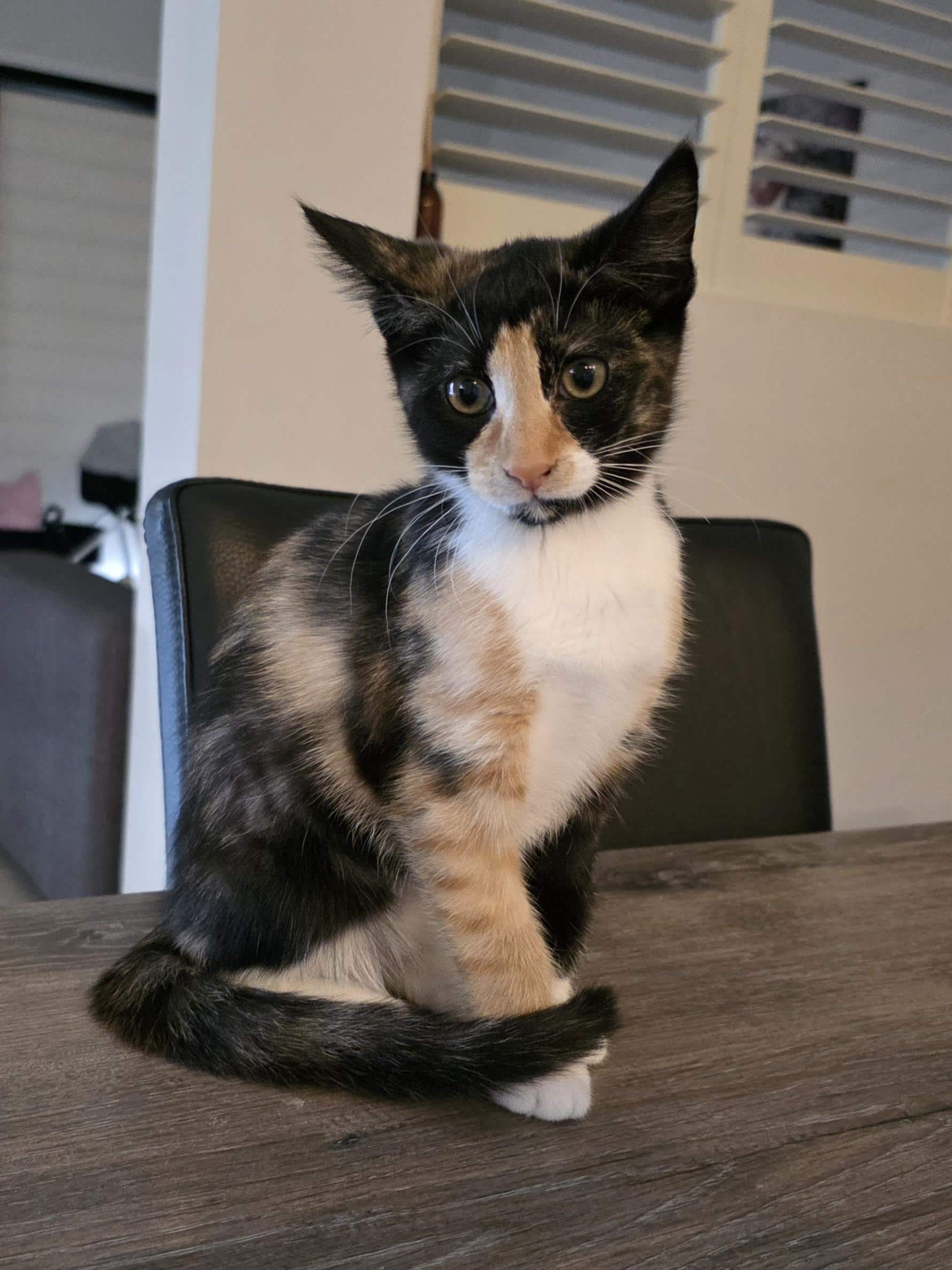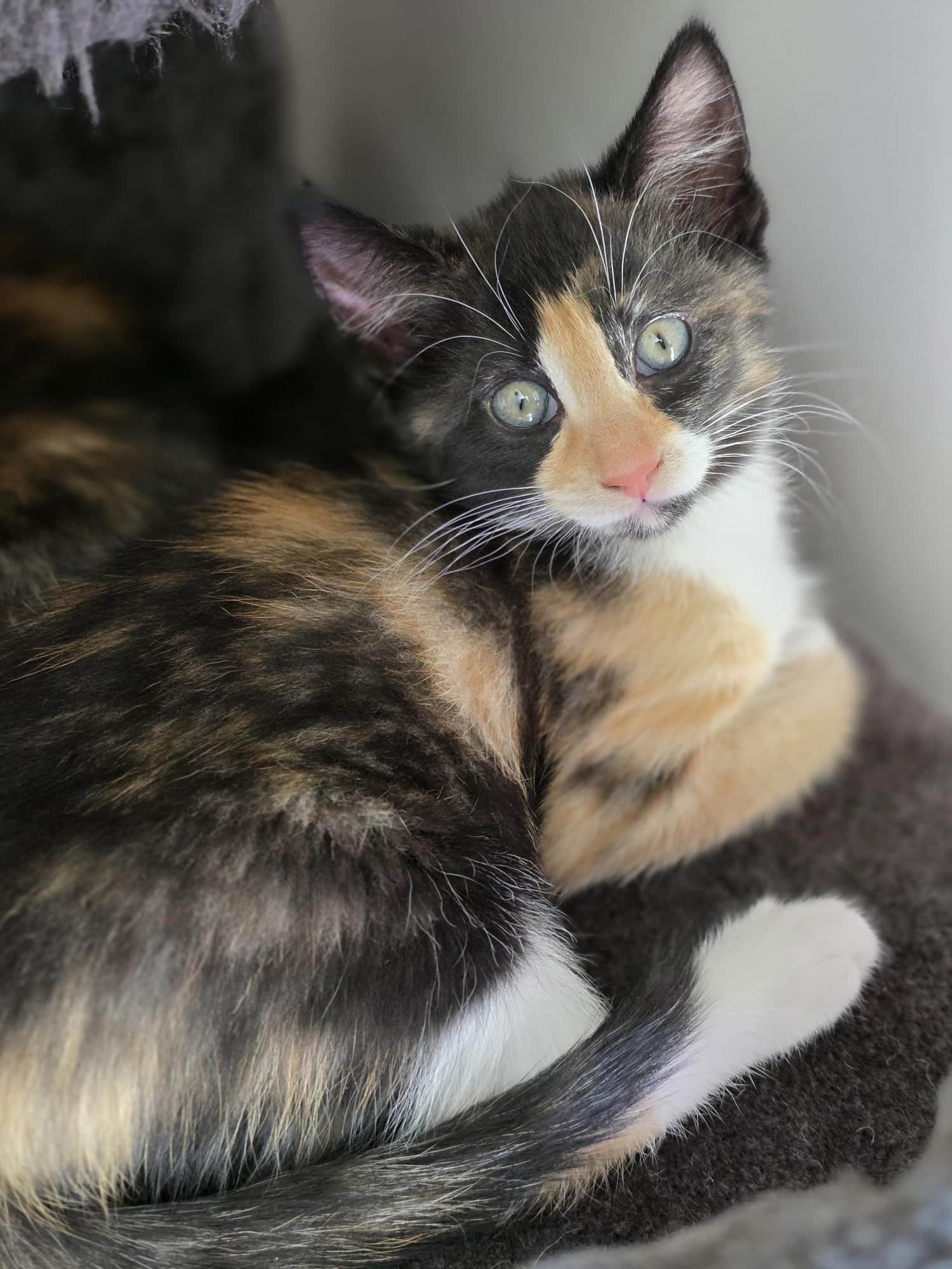 I am a sweet little kitten looking for my furever home. I am a true mummas girl and love nothing more than spending time romping and playing with my young mum, she is my best friend. You will find me chasing her, catching her tail and rolling around on the floor together with her. I love chasing ribbons and balls and enjoy getting to know every inch of the room I am in.