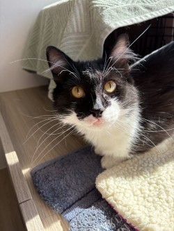 My foster carer is always telling me that I'm a beautiful boy. She also tells me I'm a spoiled, lazy cat. I'll admit to enjoying sleeping on her bed once I've had my breakfast. Having eaten all my dry food during the night, I start my day with some delicious wet food. That's when I go back to bed. My carer must be quick and make her bed while I'm eating breakfast, or the bed stays unmade all day. I don't mind either way. I will snack on biscuits throughout the day between sleeps. After my dinner of wet food, I like to sit at the front door or in the window and look outside. Sometimes I walk into my carry box and go outside with my carer. I'll often sit with my carer on the reclining chair between her legs while she watches television. I am a good companion cat who enjoys being combed, scratched, and patted. I don't know what my ideal home would be as I'm only 1 year old and have only experienced a quiet home where my carer is mostly at home with me. I need a small amount of medicine each night to treat my upper right side lip. I'm used to this now, so it's no big deal.