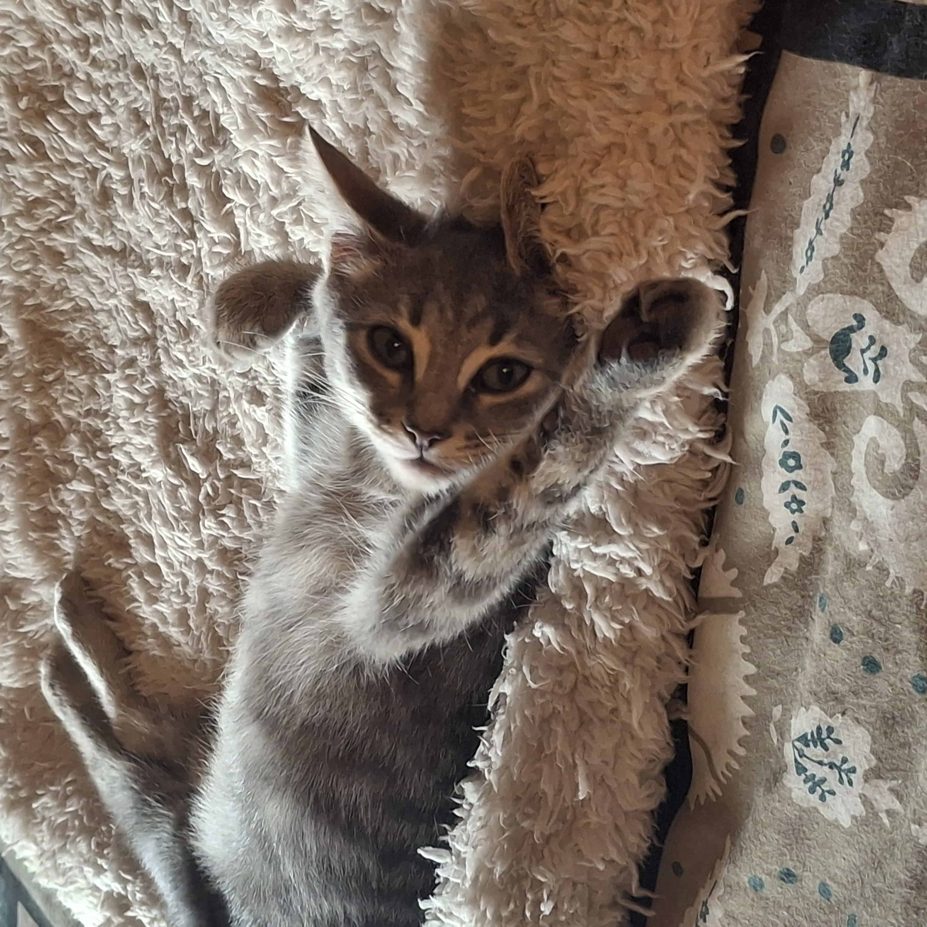 - once I have settled in and get to know you, I am open to some affection and enjoy leaning into slow pats around my face and along my back although I'm a little head shy - hands coming down over my head can make me flinch sometimes. I've become a bit of a lap cat lately - curling up for a short nap to recharge my batteries for some more play!