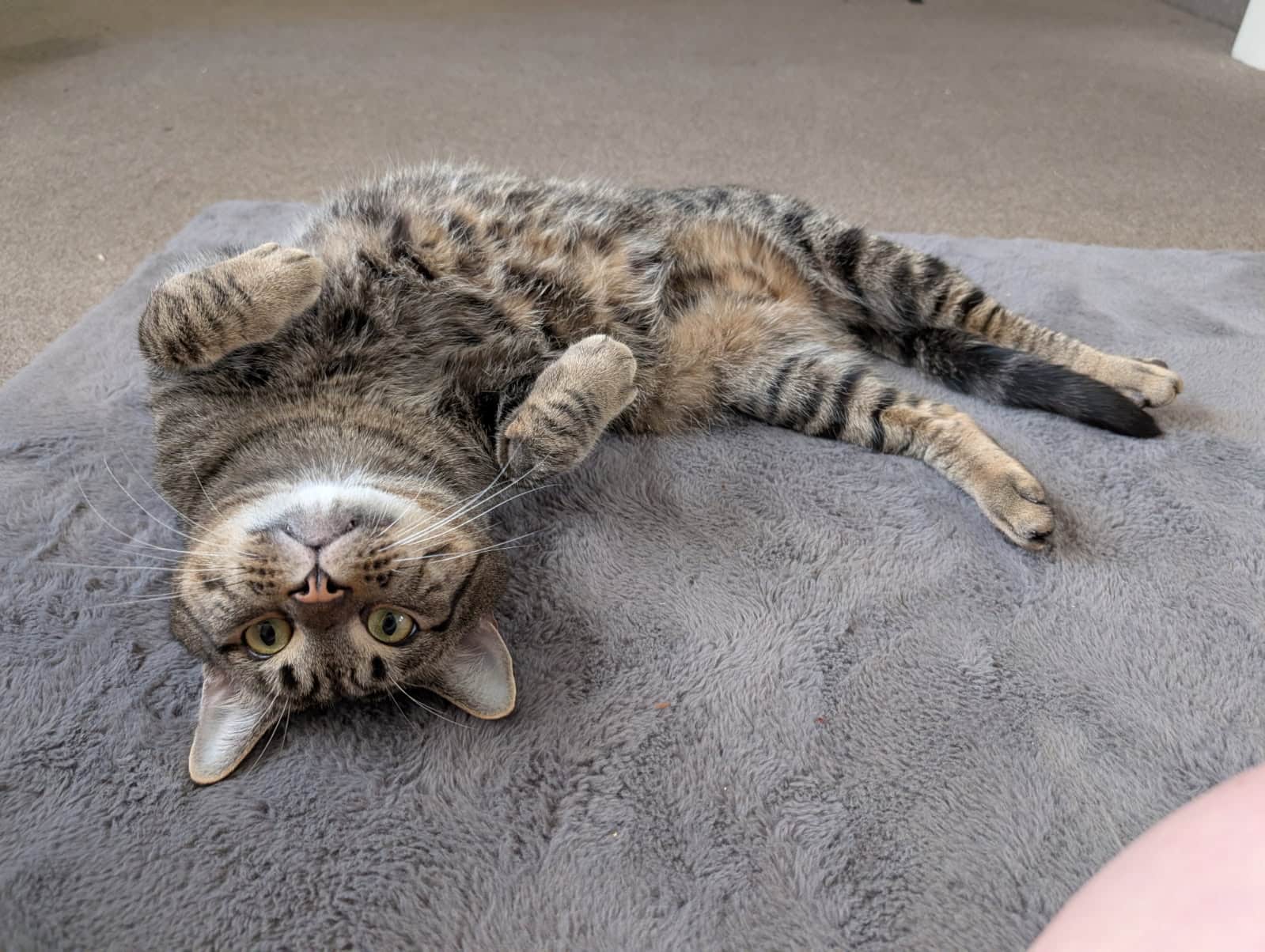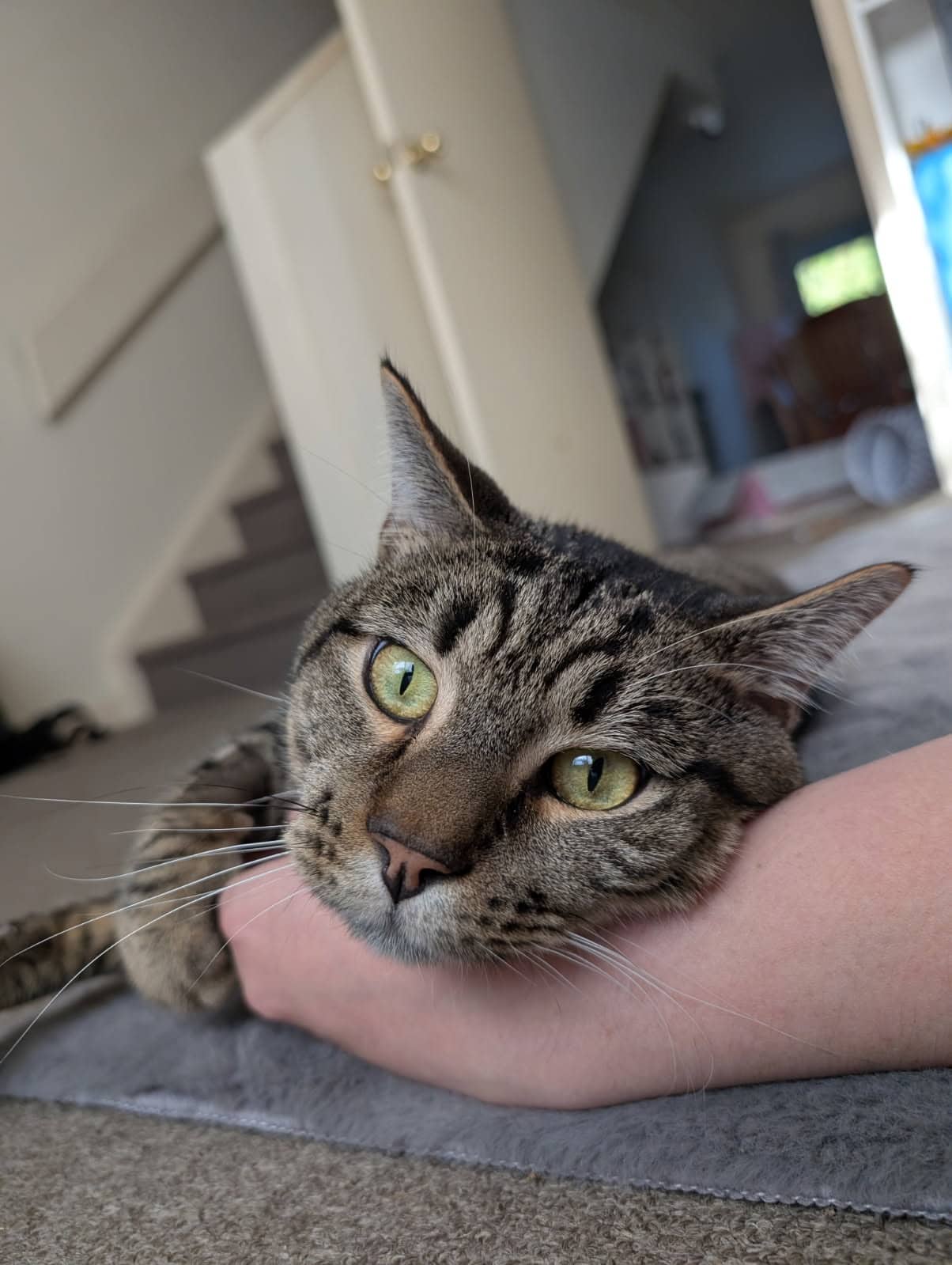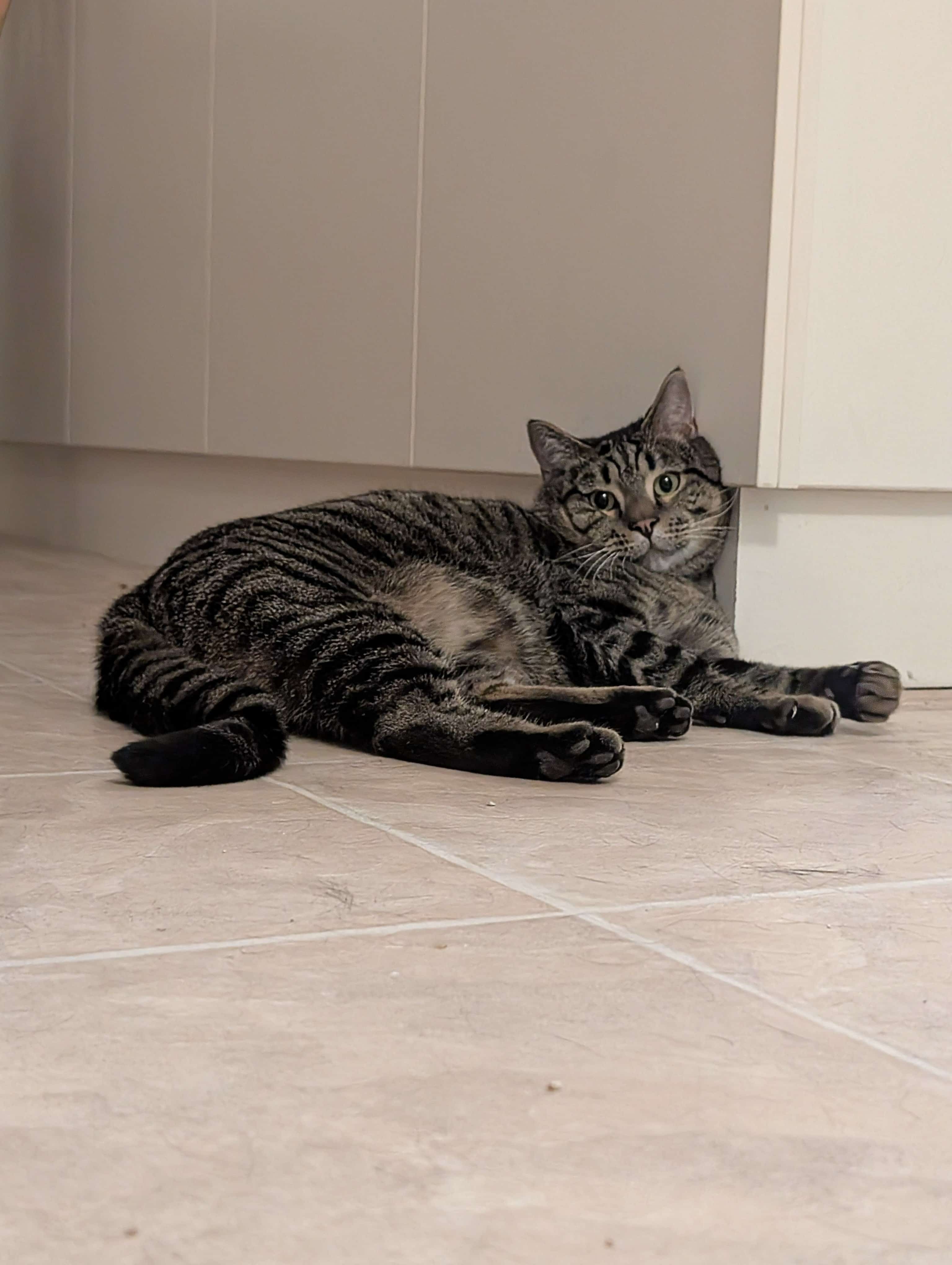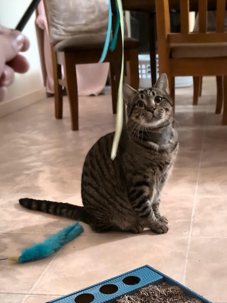I also have a playful side! Once I’m comfortable, I enjoy a bit of fun with my toys and will happily show you my silly, curious moments too. My funniest and most special habit is sometimes I’ll suddenly flop down beside you like I’ve melted into the floor. It’s my way of saying, “Yep, this is the good life.”